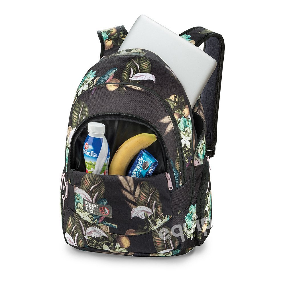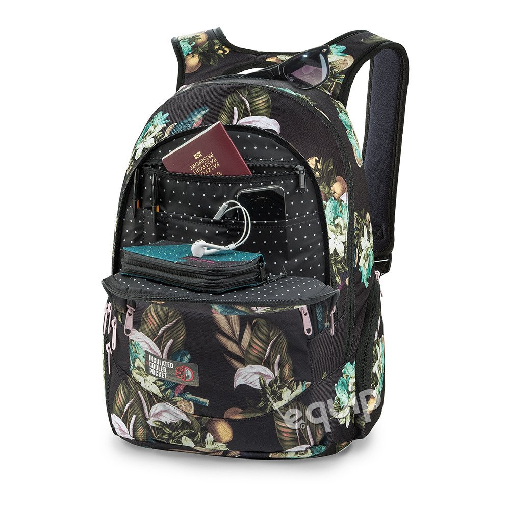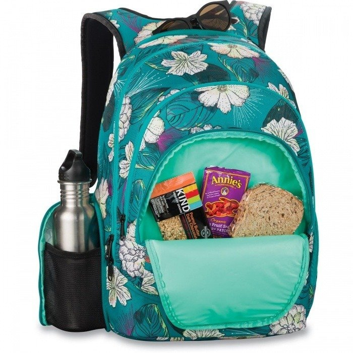 Dakine Prom to jeden z popularniejszych modeli plecaków miejskich Dakine. Przeznaczony jest przede wszystkim dla dziewczyn i kobiet. Pojemna komora główna pomieści nie tylko książki i foldery, ale również laptopa lub notebooka. Dzięki mocnego materiałowi poliestrowemu 600D nie musisz się obawiać czy plecak wytrzyma trudy całodniowego dźwigania ciężkich przedmiotów. Przednia kieszeń z organizerem pomieści przydatne na co dzień akcesoria jak klucze, długopisy, notatki itp. U góry plecaka została wszyta dodatkowa kieszeń pokryta miękkim i delikatnym materiałem zabezpieczającym zawartość przed zarysowaniem. Polecamy ten schowek wykorzystać na okulary lub drobny sprzęt IT jak MP3. Dwie boczne kieszenie bez problemu pomieszczą jeszcze więcej drobniejszych przedmiotów jak również butelkę z napojem. Z przodu znajduje się pomysłowa kieszeń pokryta materiałem termoizolacyjnym, dzięki której drugie śniadanie lub napój dłużej utrzymają świeżość i temperaturę. Dużym plusem plecaka Prom są również wygodne, lekko usztywnione plecy oraz szelki wyprofilowane w kształt litery S. Polecamy ten model zarówno do użytku szkolnego jak i miejskiego.