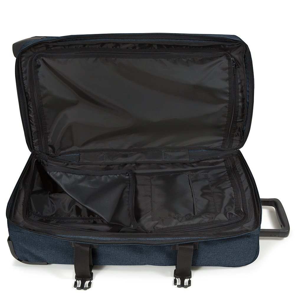 Eastpak Tranverz M to bardzo wysokiej jakości pojemna torba podróżna na kółkach. Wykonana z wytrzymałych komponentów, na które producent oferuje aż 30 lat gwarancji. Dwa swobodnie kręcące się kółka zostały wykonane całkowicie z kauczuku, który świetnie amortyzuje wstrząsy. Dodatkowo kółka wzmocnione są metalowym łożyskiem. Wnętrze zostało podzielone na 2 części, ułatwiające organizację bagażu.