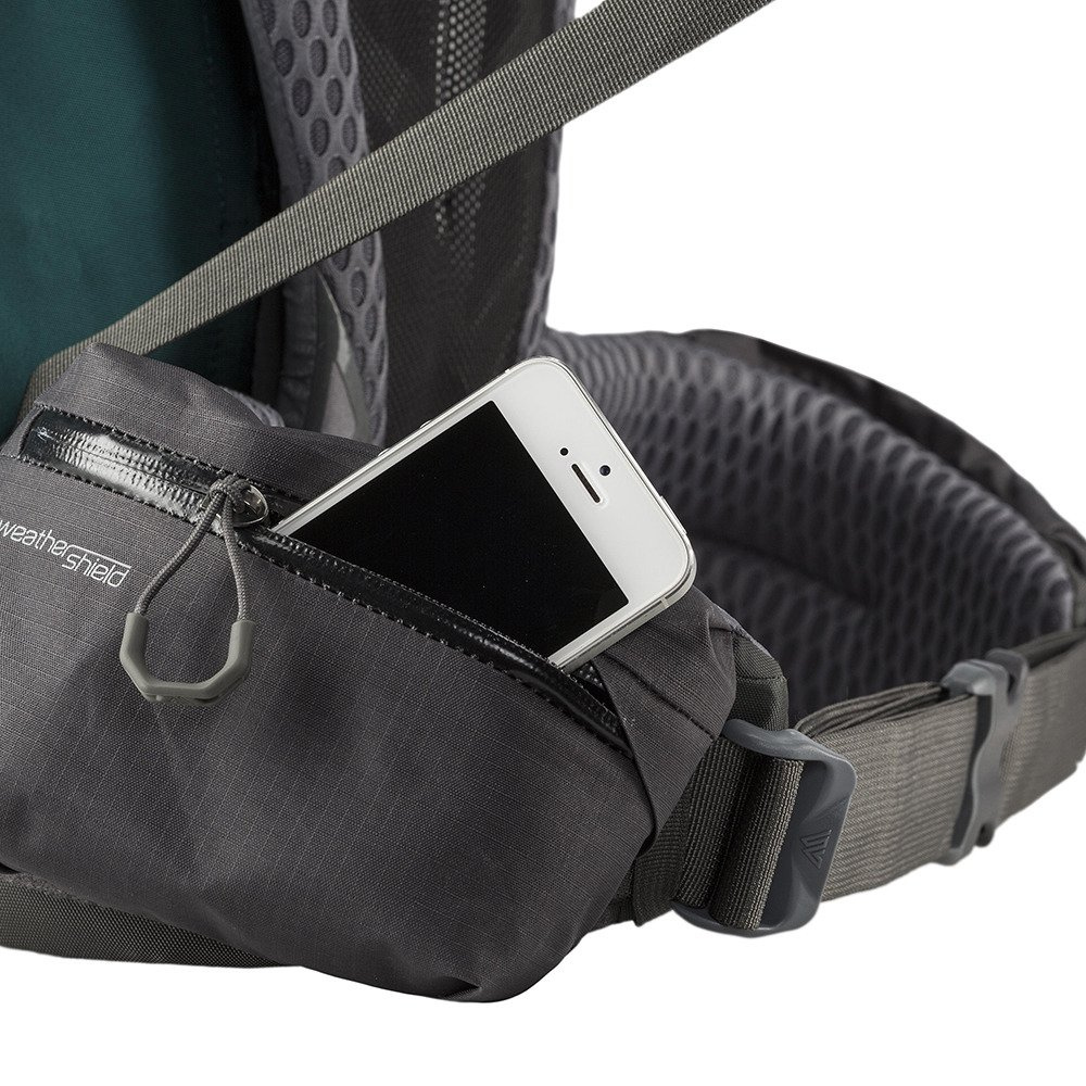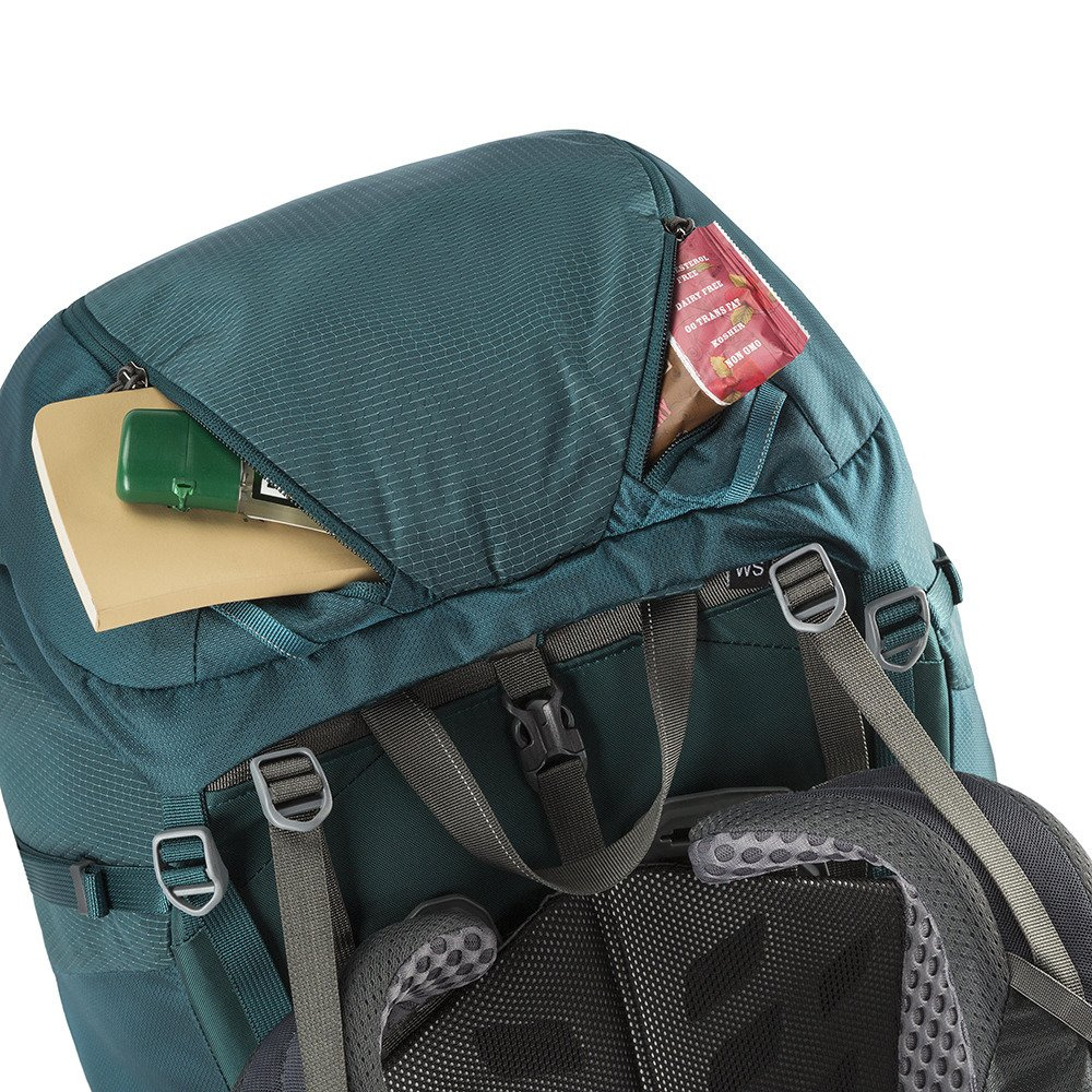 Dużą ilość mniejszych kieszeni i przegródek na zewnątrz plecaka ułatwia organizację drobniejszych przedmiotów. W samym pasie biodrowym znajdują się 2 kieszenie. Jedna z elastycznej siatki i druga z wodoodpornego materiału zabezpieczona również wodoodpornym suwakiem. Zmieści ona np. telefon. Górna klapa posiada aż 3 kieszenie. Dwie z nich umieszczone są symetrycznie na zewnątrz, natomiast trzecia ukryta jest po wewnętrznej stronie klapy. Kolejna kieszeń, w której schowasz przedmioty wymagające szybkiego dostępu umiejscowiona została na froncie plecaka. Ciekawym rozwiązaniem jest wyjmowana kieszeń na dużą butelkę z wodą. Wewnątrz komory głównej niespodzianka - przegroda na bukłak po wyjęciu przekształca się w nieduży plecaczek, który można używać niezależnie od głównego bagażu.