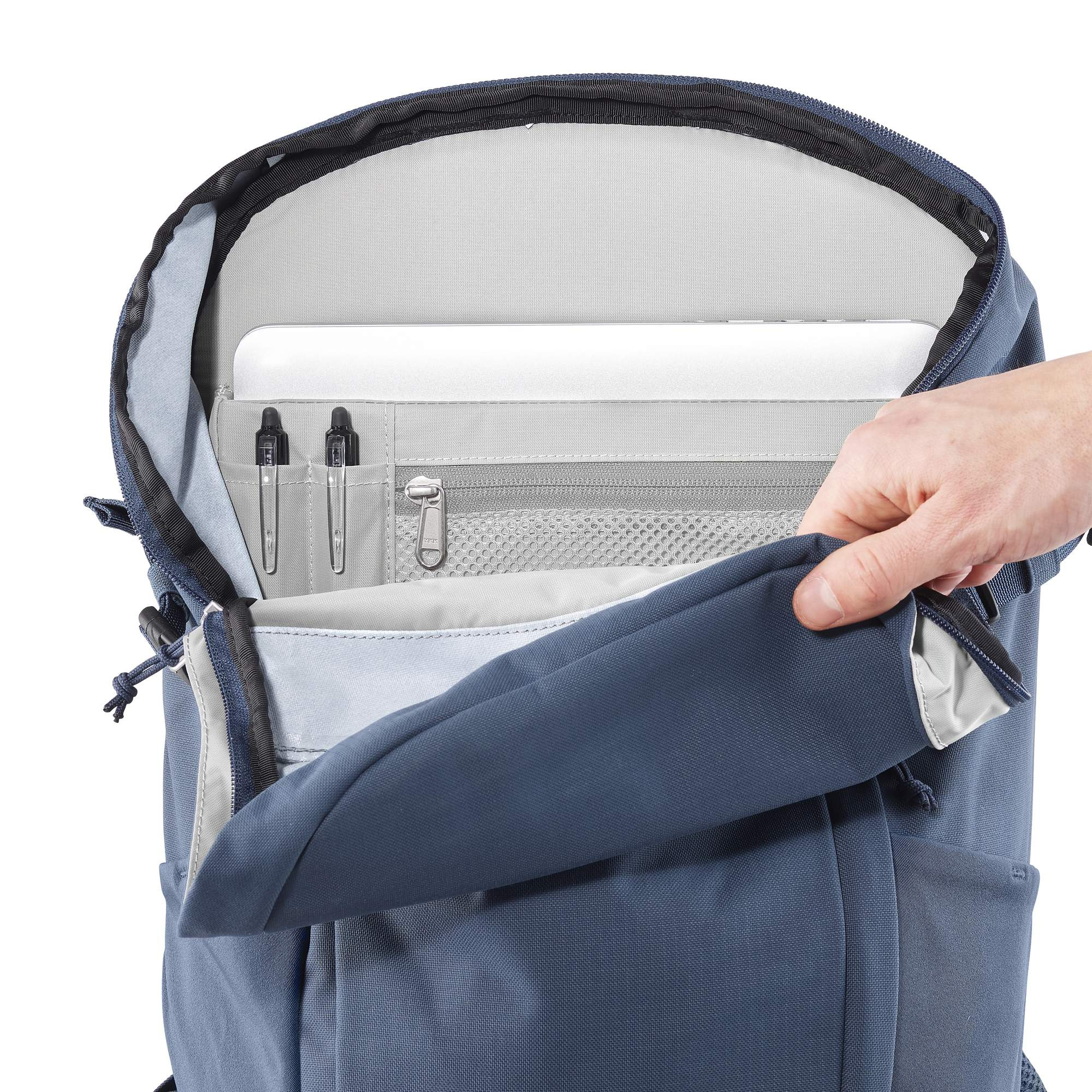 Dostęp do plecaka zapewniony szerokim otwarciem w kształcie litery U. Wnętrze kryje w sobie kieszeń na laptopa oraz mniejsze kieszenie organizacyjne mieszczące np. długopisy czy notes.
