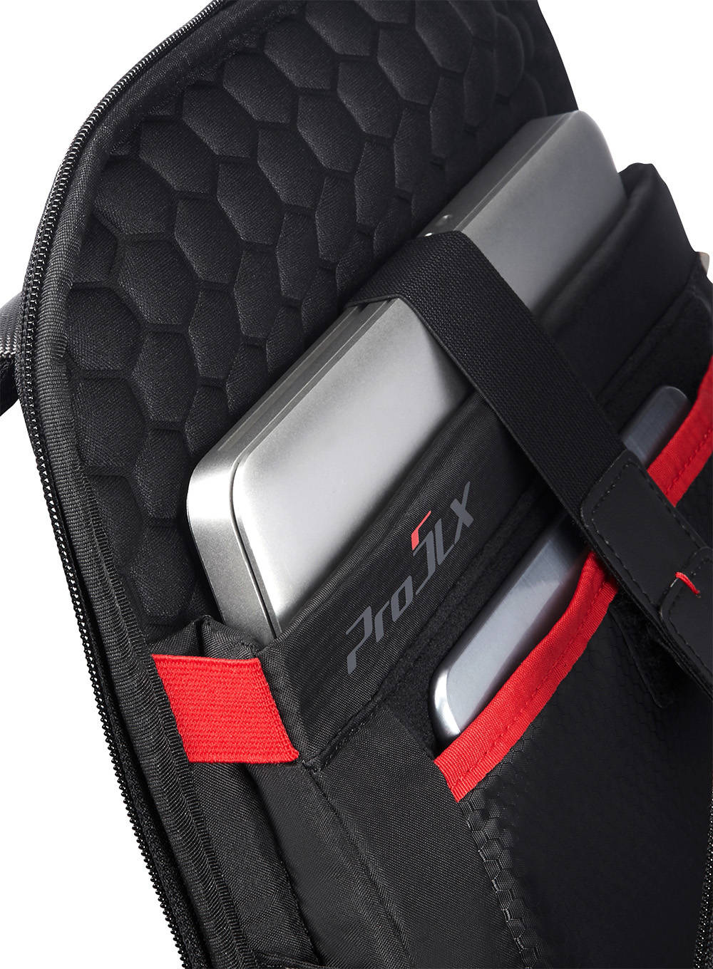 Na zewnątrz plecak na laptopa Samsonite Pro DLX 5 ma wiele funkcji ułatwiających poruszanie się użytkownikom, począwszy od regulowanych i wyściełanych pasków naramiennych po wyściełany panel tylny. Można go również wziąć do ręki, dzięki delikatnej skórzanej rączce. Z tyłu znajduje się również pętla, idealna do umieszczenia go na uchwycie walizki i bezpiecznego transportu.