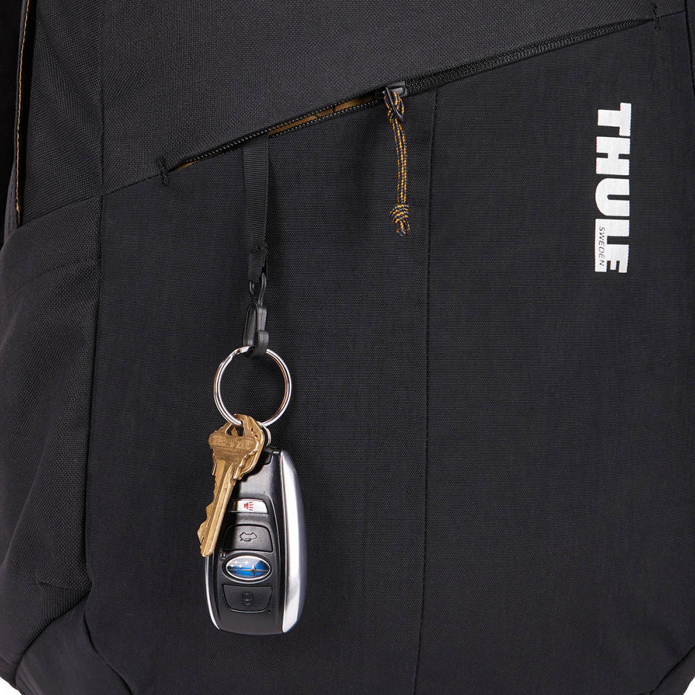 Pojemne wnętrze plecaka miejskiego Thule Notus ma miękką, podwyższoną przegrodę na laptopa, do której można schować dowolny model o maksymalnej przekątnej 16 cali. Poza tym zmieszczą się w nim książki, notatki, dodatkowa kurtka i kanapki lub pojemnik z posiłkiem. Kilka dodatkowych kieszeni umożliwia rozlokowanie drobnych rzeczy, by łatwo je odnaleźć, gdy zajdzie taka potrzeba. Jedna kieszeń wewnętrzna zamykana zamkiem błyskawicznym pozwoli zabrać portfel, przybory do pisania i inne drobiazgi. Na zewnątrz, z przodu znajduje się zasuwana kieszeń szybkiego dostępu z brelokiem do przymocowania kluczy, w której zmieszczą się mniejsze gadżety. Boczne kieszenie z elastycznej tkaniny, po obu stronach, pozwolą zabrać butelkę wody, przeciwwiatrową kurtkę albo kable i ładowarki.