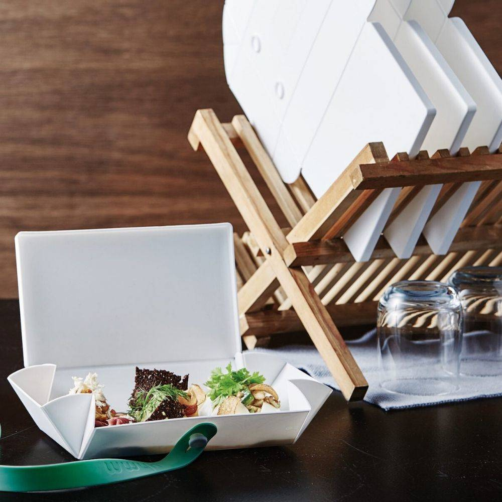 Unikalna technika składania sprawia, że pudełko jest bardzo praktyczne w codziennym użytkowaniu: nadaje się do zmywarki, lodówki lub wszędzie tam, gdzie mamy ograniczoną powierzchnię i przestrzeń.