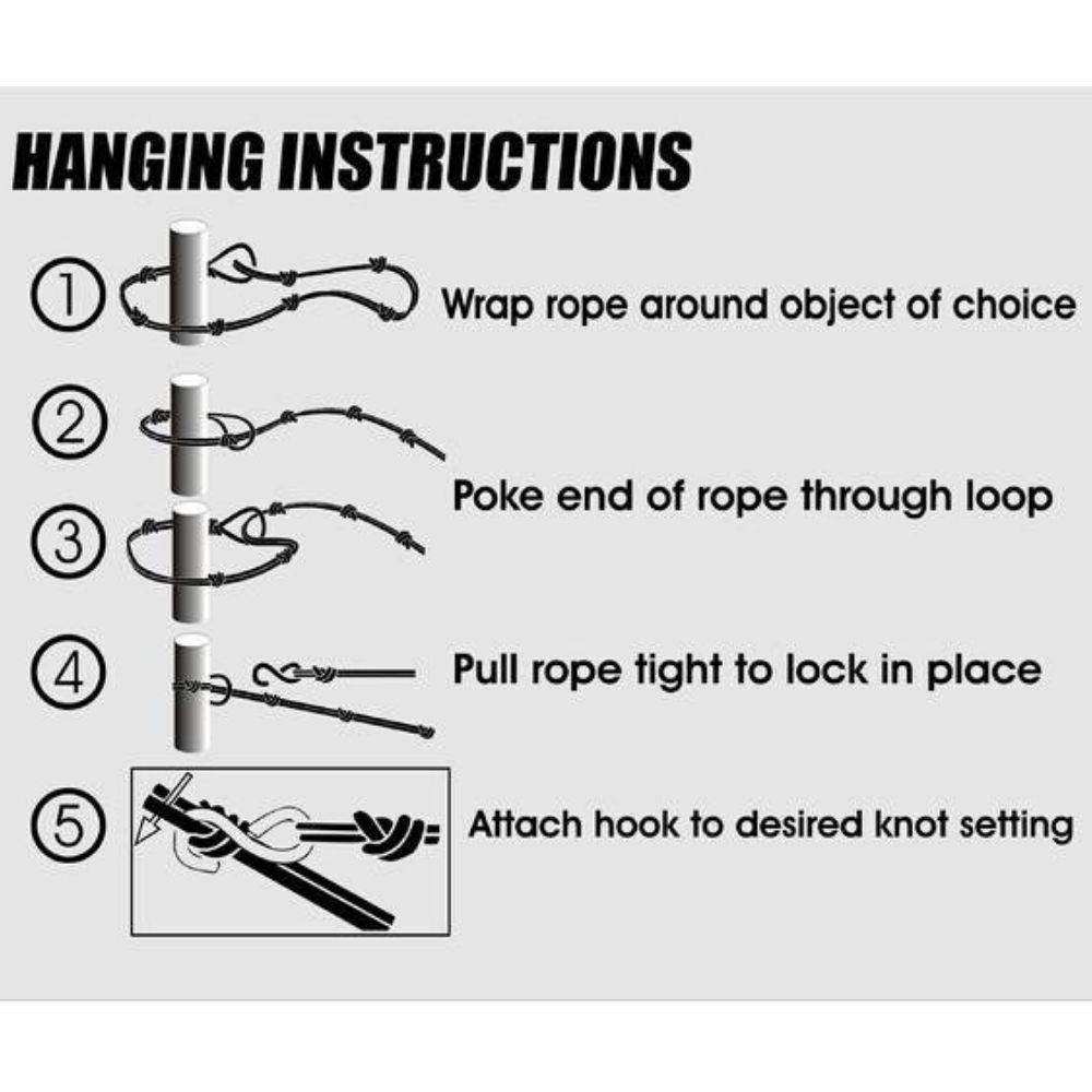 Montaż hamaka z użyciem lin jest niezwykle prosty, a instrukcja z obrazkami na futerale pozwala sprawnie rozwiesić hamak nawet osobie bez doświadczenia. Każda lina o długości 240 cm pozwala rozpiąć hamak pomiędzy dwoma oddalonymi stabilnymi elementami. Węzły wstępnie zawiązane na linie sprawiają, że jej długość można regulować, dzięki czemu miejsce do spania będzie dla nas idealnie wygodne.