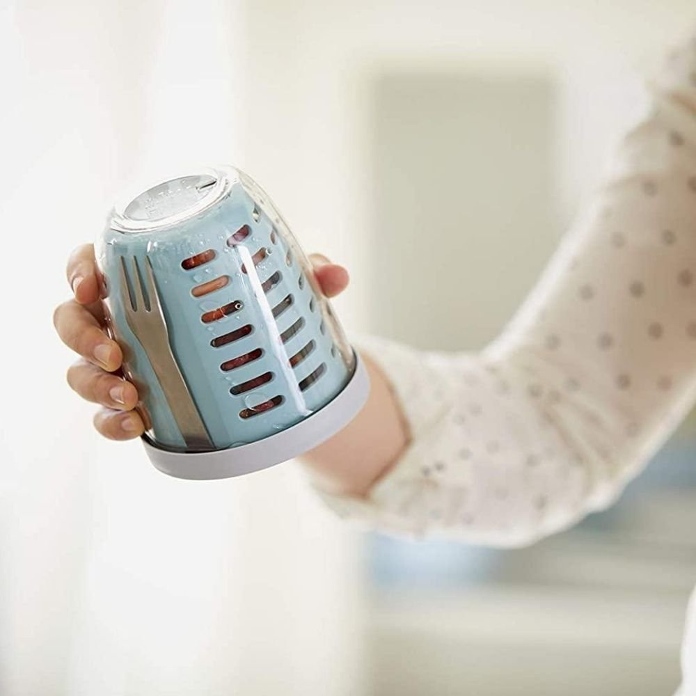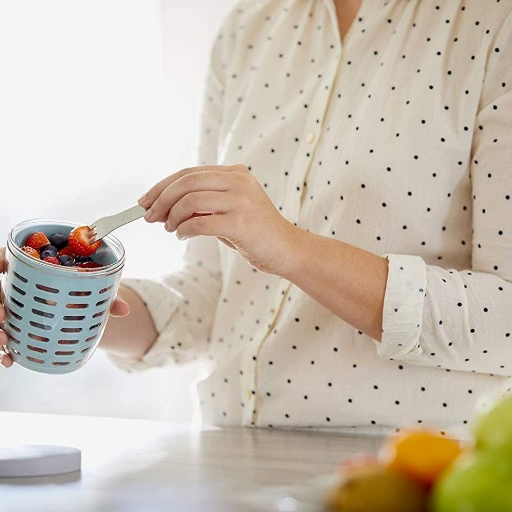 Zrób sobie przerwę i ciesz się podjadaniem soczystych truskawek przy biurku lub pyszną sałatka , gdy jedziesz pociągiem - dostarczaj swojemu organizmowi porcji witamin każdego dnia! Sitko w pojemniku pozwala opłukać warzywa i owoce pod wodą z kranu. Ponieważ woda do płukania zbiera się w pustej przestrzeni na dnie naczynia, nie powinno to przeszkadzać.