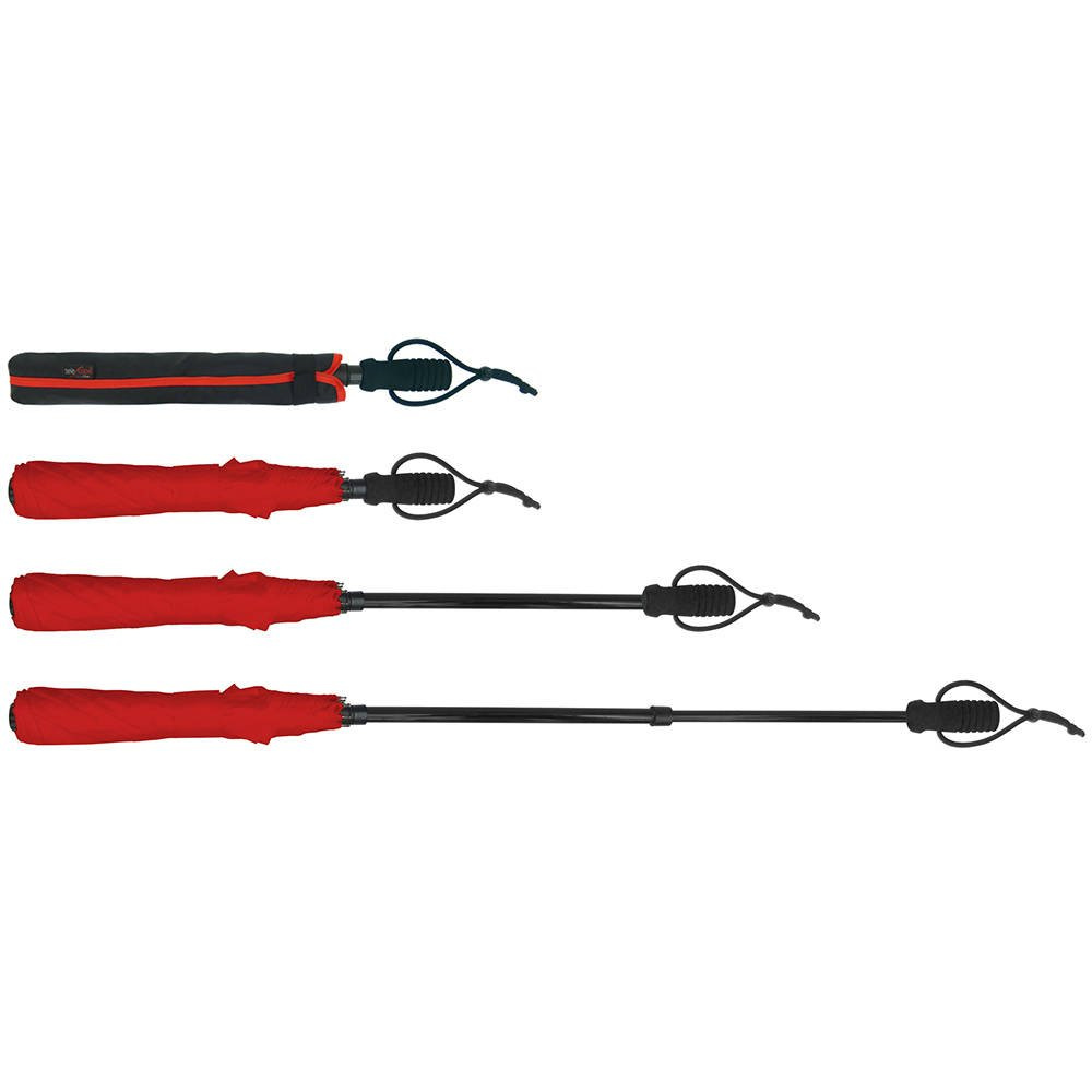 Niewątpliwym atutem wyróżniającym ten model spośród innych jest możliwość jego używania bez pomocy rąk. Dzięki mocnym rzepom Velcro możesz przypiąć parasol do pasków plecaka trekkingowego. Parasol pozostanie stabilny w pozycji pionowej lub pochylonej. Dolny uchwyt można również zaczepić o pas biodrowy plecaka zwiększając jego stabilność podczas wietrznej pogody. Dzięki takiemu rozwiązaniu wędrówka po górach z kijkami czy z dzieckiem będzie możliwa w każdą pogodę.