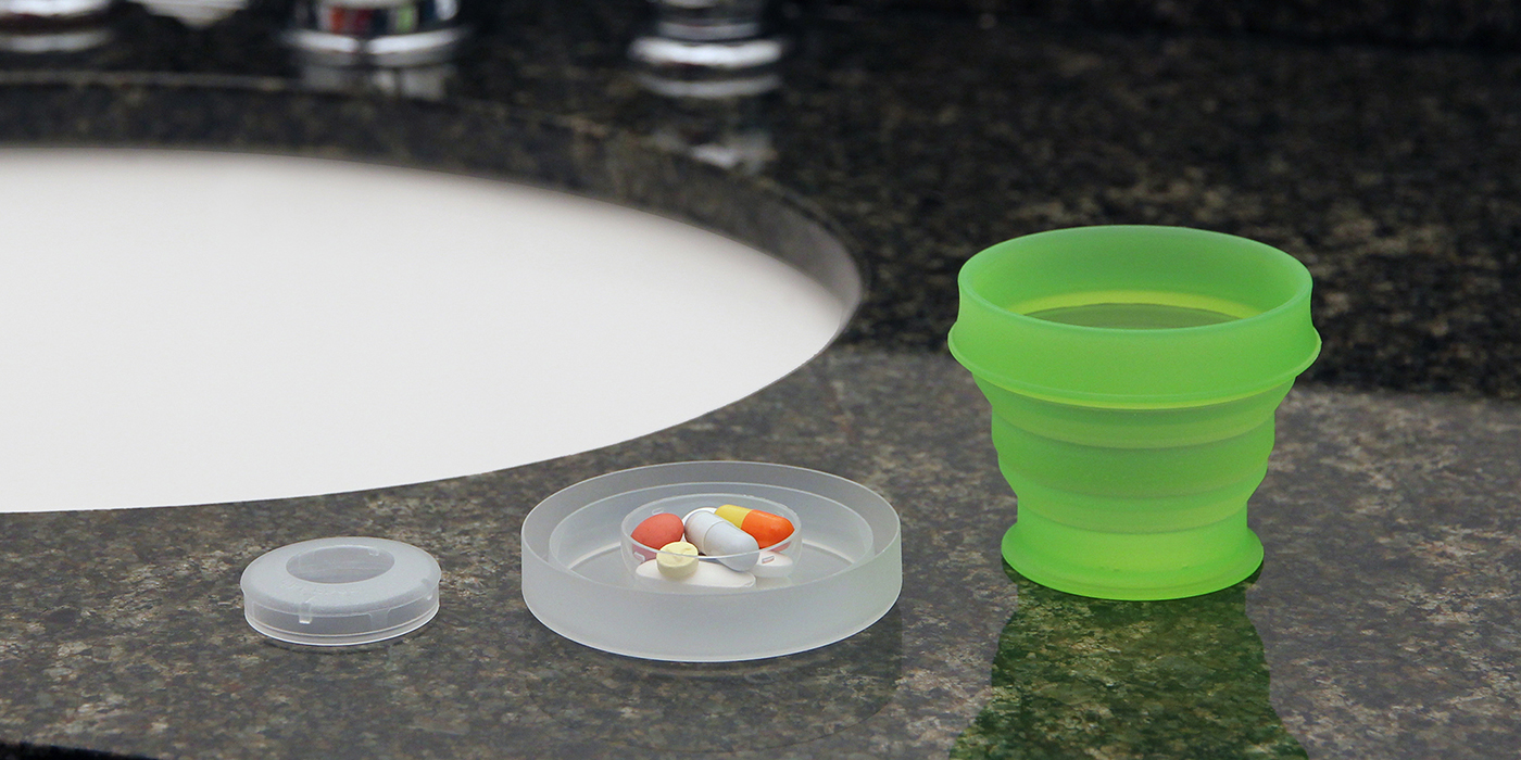Praktyczny, składany kubek z zintegrowanym pojemnikiem na tabletki.