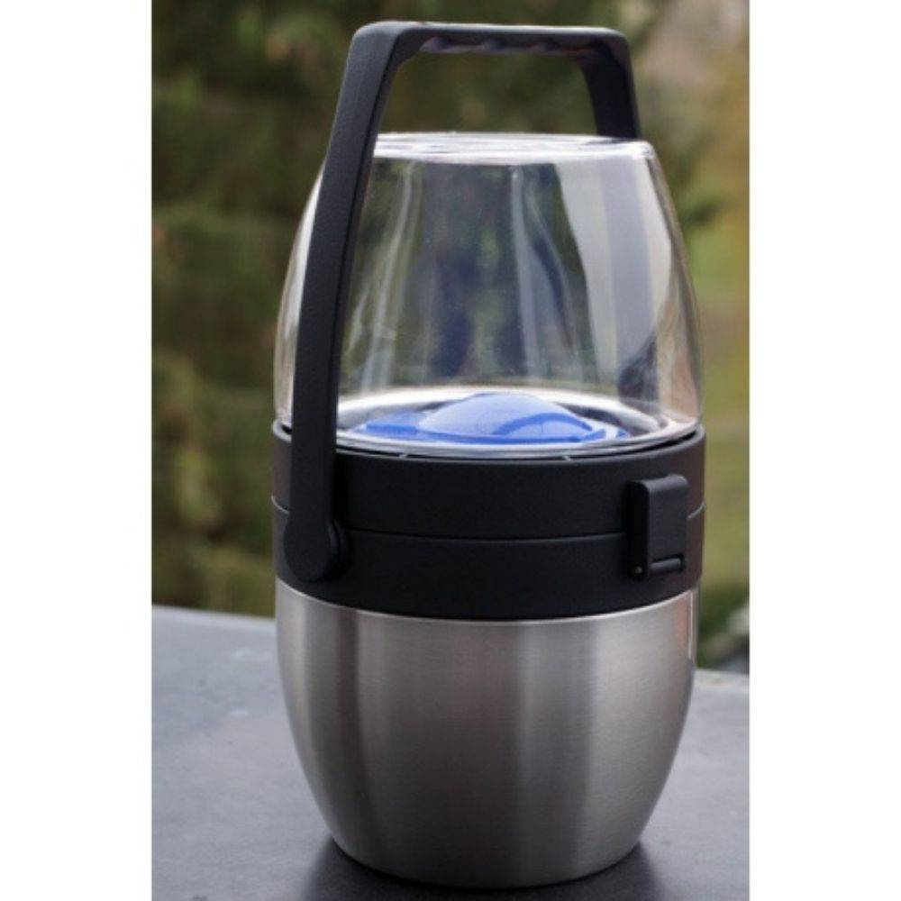 Dwukomorowy termos obiadowy jest innowacyjnym pojemnikiem na pożywienie do wielokrotnego użycia. Termos składa się z dwóch oddzielnych pojemników połączonych zawiasem. Chodzi o idealny i praktyczny design do przechowywania ciepłych i zimnych pokarmów, np. gorącej zupy w izolowanej próżniowo komorze ze stali nierdzewnej oraz świeżej sałaty w komorze z tworzywa. Komora ta wykonana jest z BPA free Eastman Tritanu. Termos można przechowywać w lodówce – zawartość próżniowo izolowanej komory pozostaje ciepła.