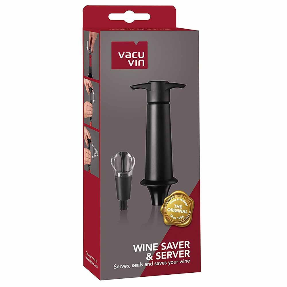 Wine Wine Server & Saver Vacu Vin to pompka próżniowa, która wyciąga powietrze z otwartej butelki i ponownie ją uszczelnia gumowym korkiem wielokrotnego użytku. W komplecie znajduje się również praktyczny korek, który szczelnie zamyka butelkę. Korek poprzez przesunięcie trzonka do góry zamienia się w praktyczny nalewak, który zabezpieczy przed uronieniem choćby kropelki wina podczas nalewania.