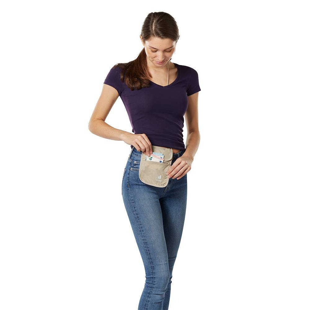 Dyskretna saszetka zawieszana na szyję Deuter Security Wallet II idealna na dokumenty, karty i gotówkę, gdy planujemy podróż.