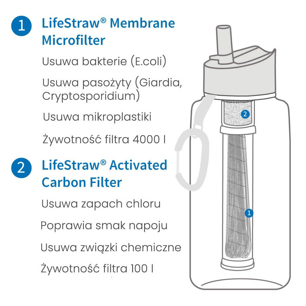 Filtry z węglem aktywnym LifeStraw poprawiają smak wody, usuwając chemikalia, takie jak chlor i zapachy. Węgiel aktywny został poddany specjalnym procesom, aby otworzyć miliony maleńkich porów między atomami węgla. LifeStraw wykorzystuje zaawansowaną, specjalną formułę, która jest wykonana z włókien zamiast tradycyjnego granulowanego węgla, co poprawia trwałość i wydajność. Proces ten działa na zasadzie adsorpcji - zanieczyszczenia zostają uwięzione w strukturze porów węgla i wiążą się z powierzchniami włókien. Z biegiem czasu, gdy wszystkie powierzchnie są pełne, filtr węglowy należy wymienić. Żywotność filtra z węgla aktywnego Lifestraw wynosi ok. 100 l.