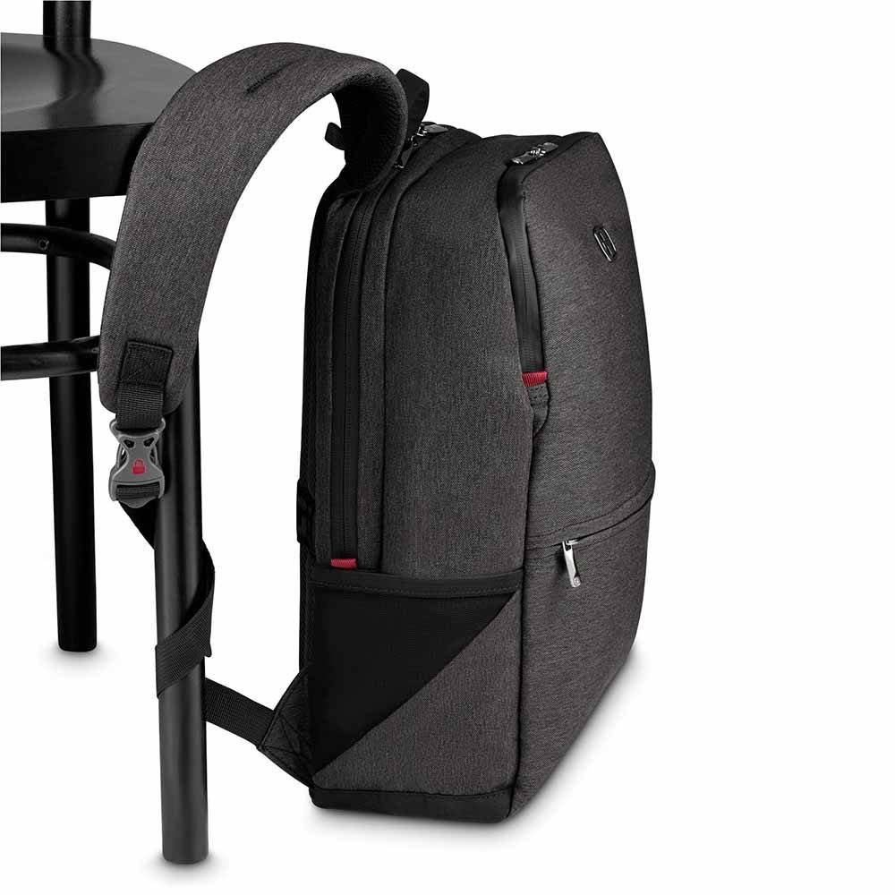 Plecak miejski MX Reload Wenger ma przegrodę na laptop do 14 cali i specjalne zabezpieczenie klamrę S / R do bezpiecznego mocowania przy stabilnych przedmiotach.