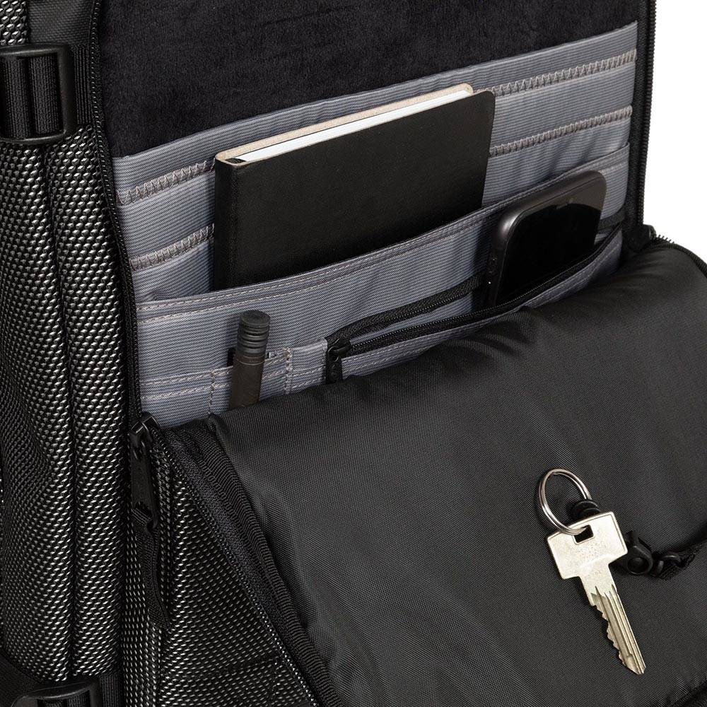 Pojemne wnętrze podzielone jest na dwie oddzielne komory zamykane tekstylnymi przekładkami. W przedniej kieszenie plecaka znajduje się wyściełana, otarta kieszeń na laptop, kieszenie na inne drobne przedmioty oraz brelok do przypięcia kluczy. Zewnętrzne kieszenie torby umożliwiają zabranie butelki z wodą i telefonu i znacznie ułatwiają organizację podczas pakowania.