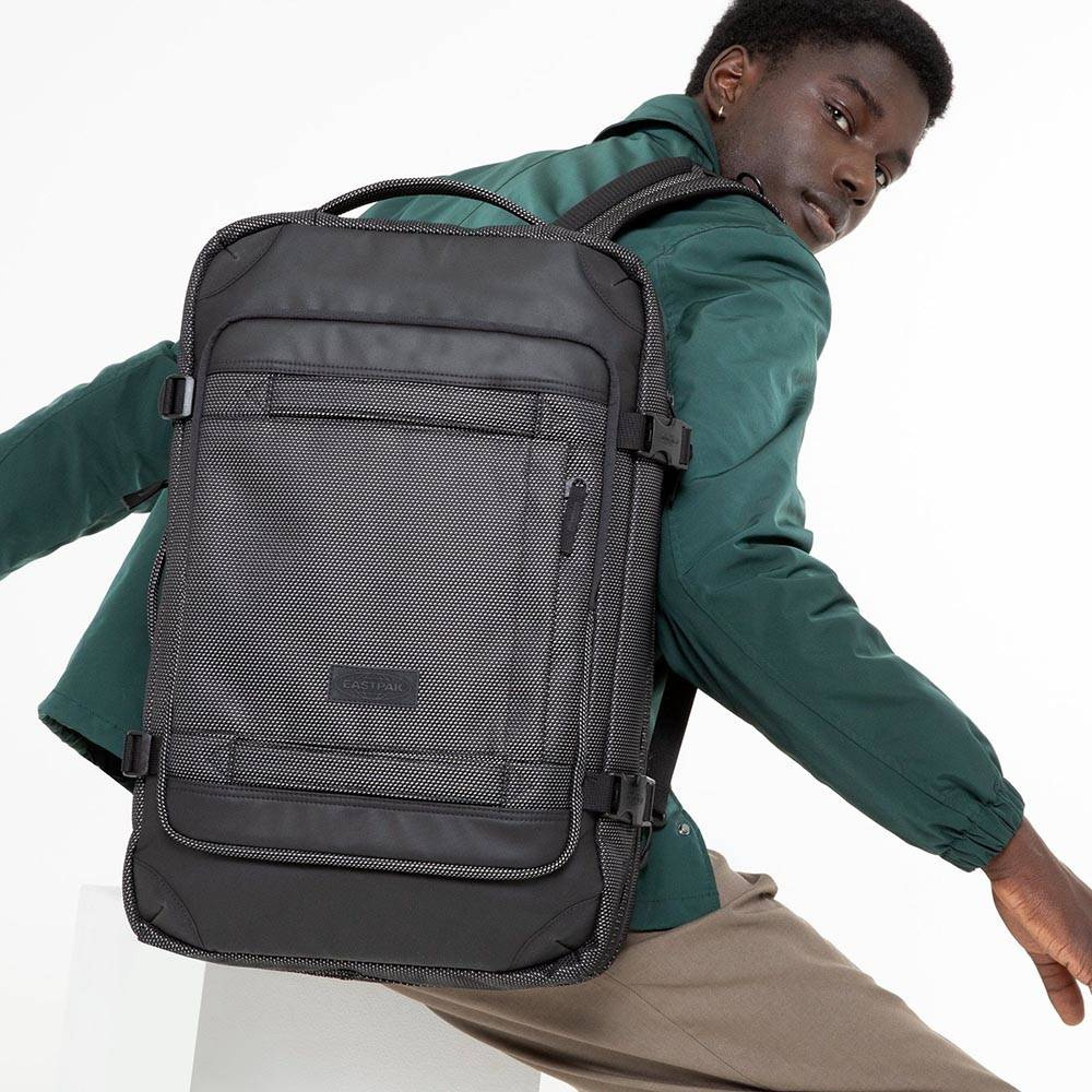 Praktyczną torbę podręczną Eastpak Tranzpack CNNCT można łatwo przekształcić w plecak, dzięki chowanym, regulowanym pasom ramiennym. Dla dodatkowej stabilizacji model Eastpak Tranzpack CNNCT posiada regulowany pas zapinany na mostku, a w razie podróży z walizką plecak można umocować na wysuwanym uchwycie dzięki specjalnemu paskowi z tyłu. Miękkie, wyściełane pasy ramienne i dodatkowe uchwyty do trzymania w dłoni pozwalają na modyfikowany sposób użytkowania torby.