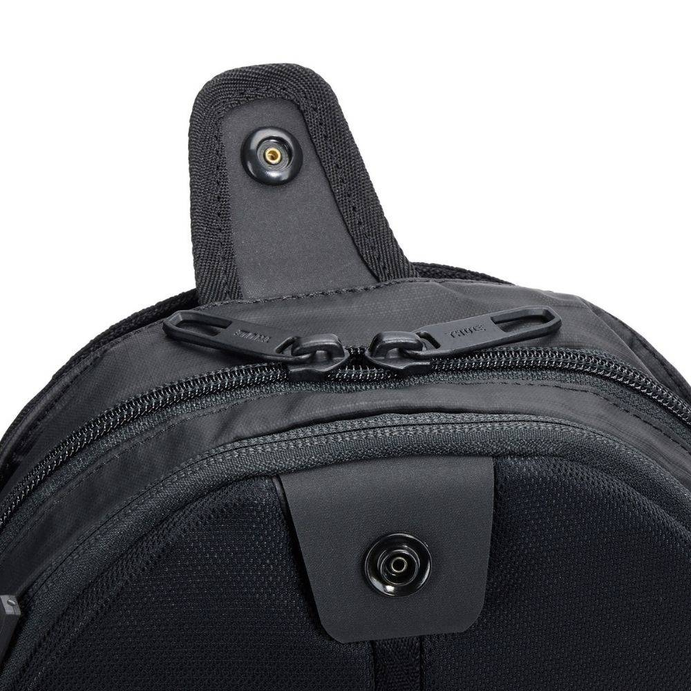 - Zawartość pozostaje zabezpieczona w głównej komorze dzięki ukrytym zamkom błyskawicznym, otworowi z tyłu i klapie na zatrzask, która zamyka się na zamek błyskawiczny dla większego bezpieczeństwa