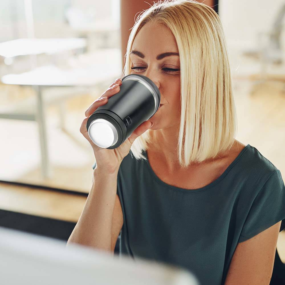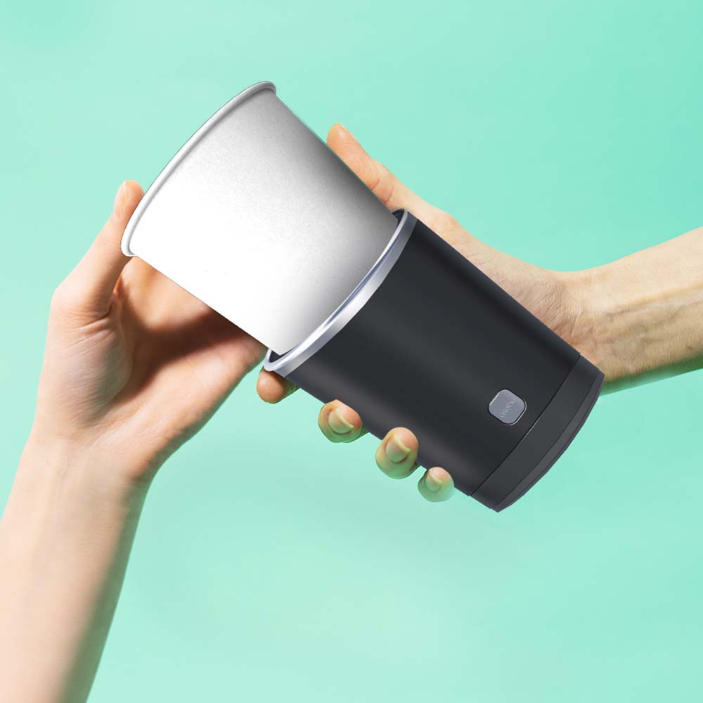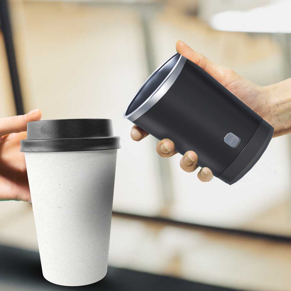 Otwarty na górze i dole pojemnik został zaprojektowany tak by pasował do większości kubków znanych marek w kawiarniach. Wykonany ze stali nierdzewnej utrzymuje ciepłą temperaturę kawy lub herbaty dzięki zastosowaniu podwójnych ścianek.