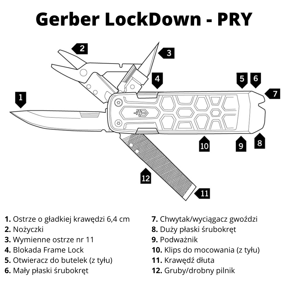 Kompaktowe narzędzie wielofunkcyjne Gerber LockDown Pry skrywa 10 narzędzi: łom, mały płaski śrubokręt, ściągacz do gwoździ, duży płaski śrubokręt, otwieracz do butelek, ostrze o gładkiej krawędzi 2,5”, krawędź dłuta, gruby i cienki pilnik oraz wymienne gładkie ostrze #11.