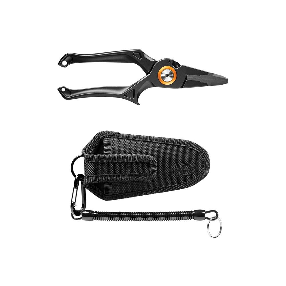 Szczypce są konstrukcją z kutego na gorąco aluminium, co pozwala na manipulowanie metalem w ergonomicznym kształcie, a także zapewnia szczypcom niezrównaną wytrzymałość. Sprężynowe szczypce zmniejszają zmęczenie dłoni i są utrzymywane w ryzach przez blokadę - co oznacza, że ​​narzędzie nie otworzy się niespodziewanie, gdy będziesz w ruchu lub łowisz ryby. Nylonowa pochwa zawiera szlufkę, d-ring i zwijaną smycz do szczypiec i może być wiązana z wielu punktów.