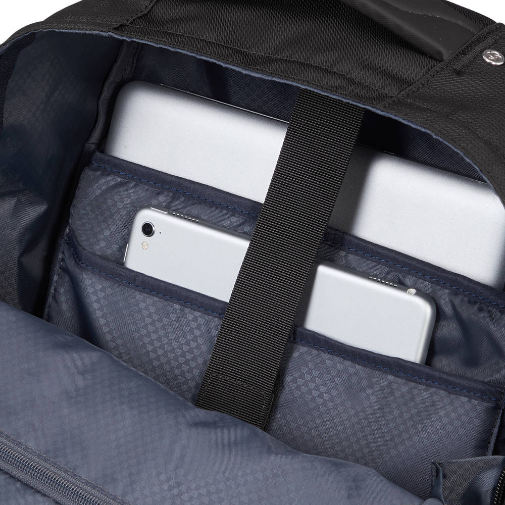 - Smart Sleeve - plecak na laptopa jest wyposażony w uchwyt z tyłu, który zapewnia bezpieczne umocowanie na teleskopowym uchwycie walizki albo torby podróżnej