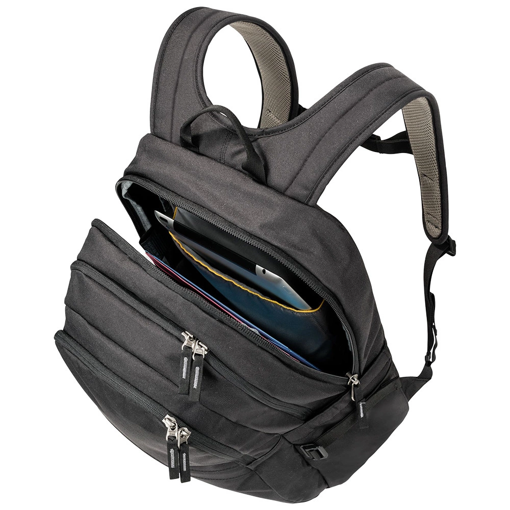 Pojemny i wygodny plecak na uczelnię, do pracy oraz do codziennego użytku Jack Wolfskin Dayton. Dwie komory główne pomieszczą dokumenty formatu A4. Pierwsza z komór ponadto posiada bezpieczną kieszeń na tablet i jest zabezpieczona grubym suwakiem w rozmiarze 10. Z przodu znajdziemy 2 kolejne, mniejsze kieszenie. Jedna płaska, otwierana po skosie oraz druga, z praktycznym organizerem, miejscem do przypięcia kluczy itp. Po bokach plecaka zastosowano 2 elastyczne kieszenie, które mogą służyć np. do przenoszenia butelki z napojem lub innych przedmiotów wymagających szybkiego dostępu.