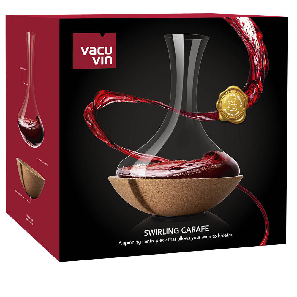 Vacu Vin wirująca karafka szklana do wina ma obracający się element centralny, który pozwala winu oddychać w wyjątkowy i elegancki sposób. Wirowanie pomaga uwolnić różne aromaty w szlachetnym trunku, zapewniając lepsze doznania smakowe