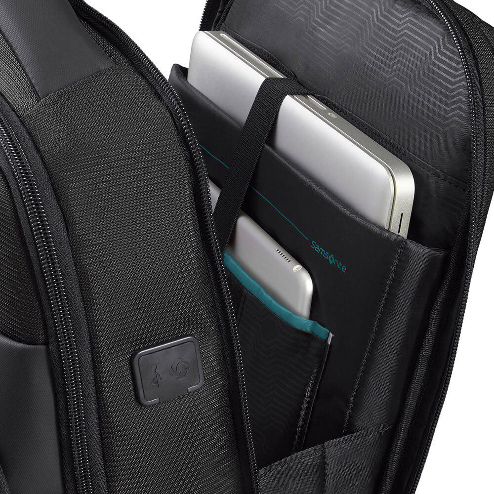 Plecak biznesowy Samsonite Mysight 17,3 ma przednią komorę na dokumenty (z elastycznym sorterem, wyjmowanym piórnikiem / saszetką i zapinaną na zamek kieszenią na różne materiały) oraz tylną komorę z wyściełanymi kieszeniami na 17,3-calowy komputer i tablet. Na zewnątrz duża kieszeń zapinana na zamek zawiera różne opcje przechowywania odpowiednich do rzeczy osobistych. Mała przednia kieszeń zapinana na zamek umożliwia na przykład błyskawiczne odnalezienie telefonu. Boczna kieszeń pozwala na przenoszenie małej butelki wody.