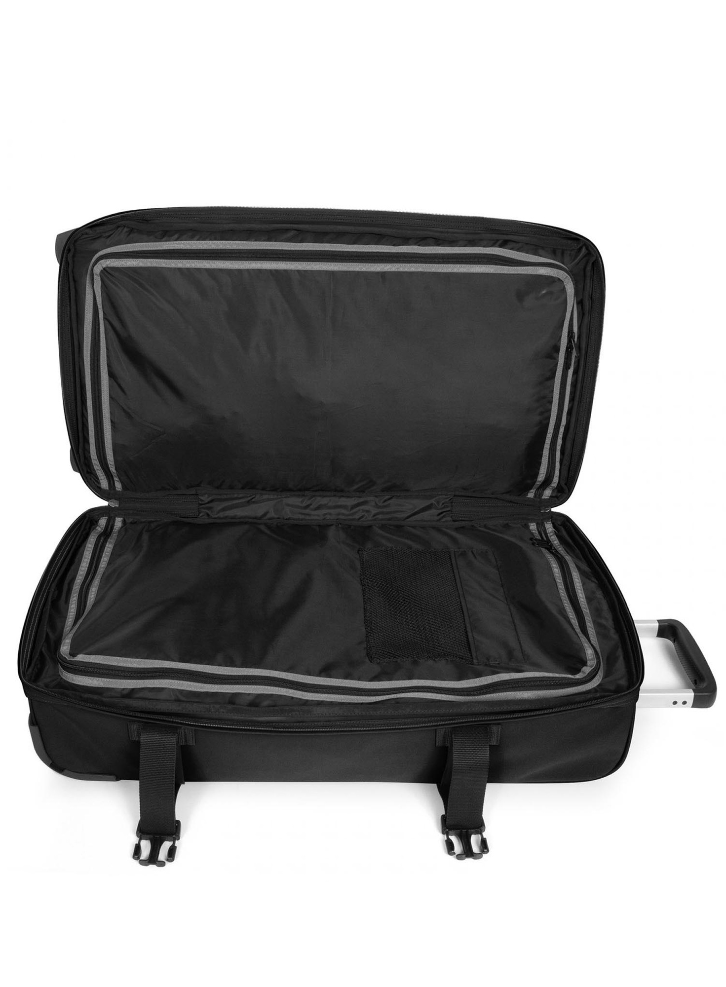 Torba podróżna Eastpak Transit'R L wykonana z wytrzymałego poliestru, bardzo pojemna i pakowna, idealna na podróże trwające nawet 3 tygodnie. Wyposażona w dwa solidne i wytrzymałe koła, który świetnie amortyzują wstrząsy oraz teleskopowy uchwyt do łatwej nawigacji. Wnętrze torby podróżnej Eastpak Transit'R L jest podzielone na 2 komory, ułatwiające organizację bagażu.