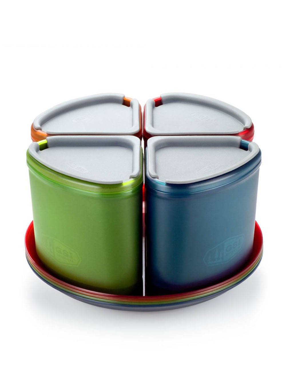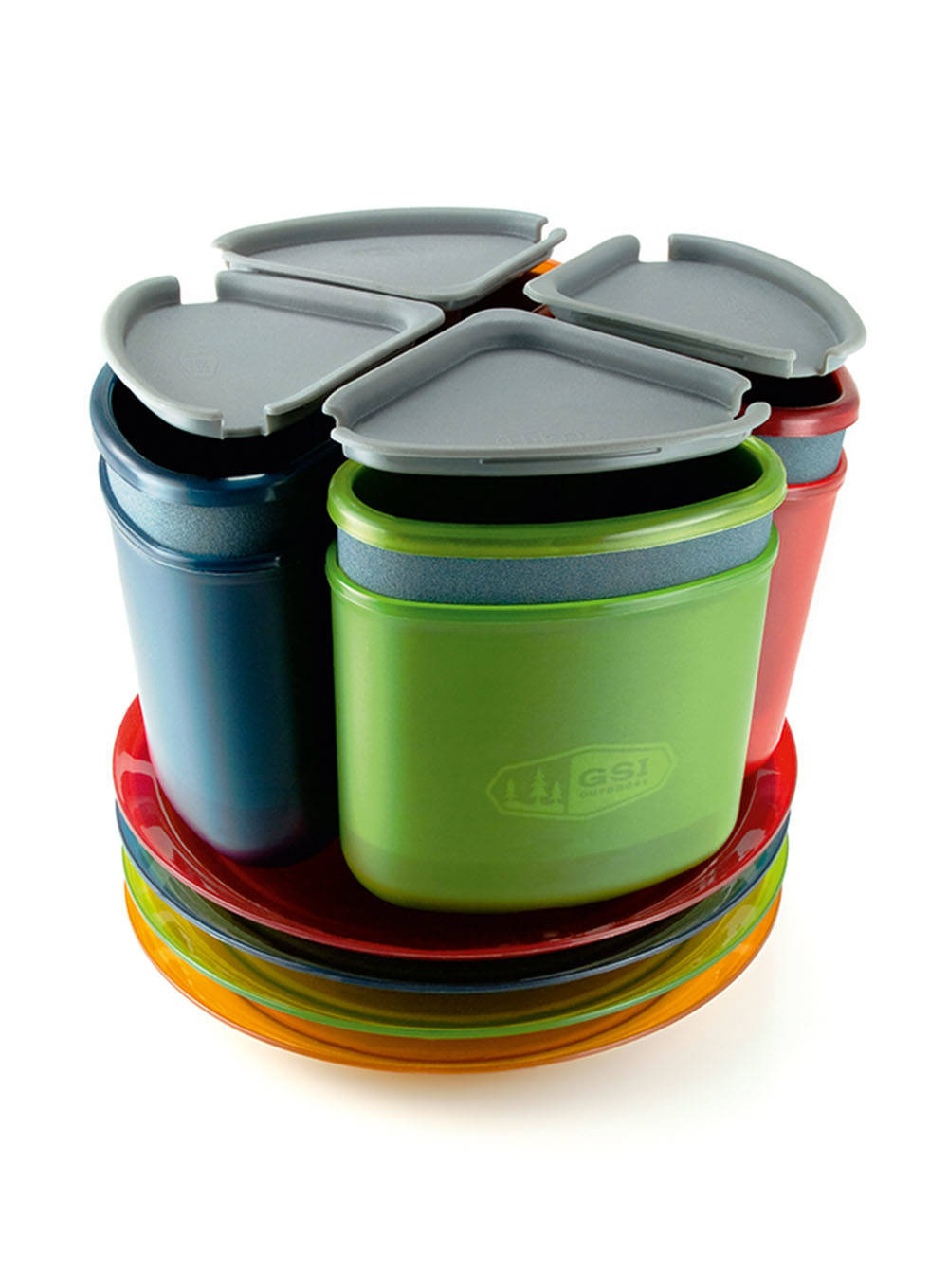 GSI Outdoors Infinity Compact Tableset dla 4 osób to kompletny system lekkiej zastawy stołowej. Obejmuje 4 kubki do zagnieżdżania, 4 izolowane kubki z pokrywkami i 4 talerze w ultra kompaktowym worku z siatki.