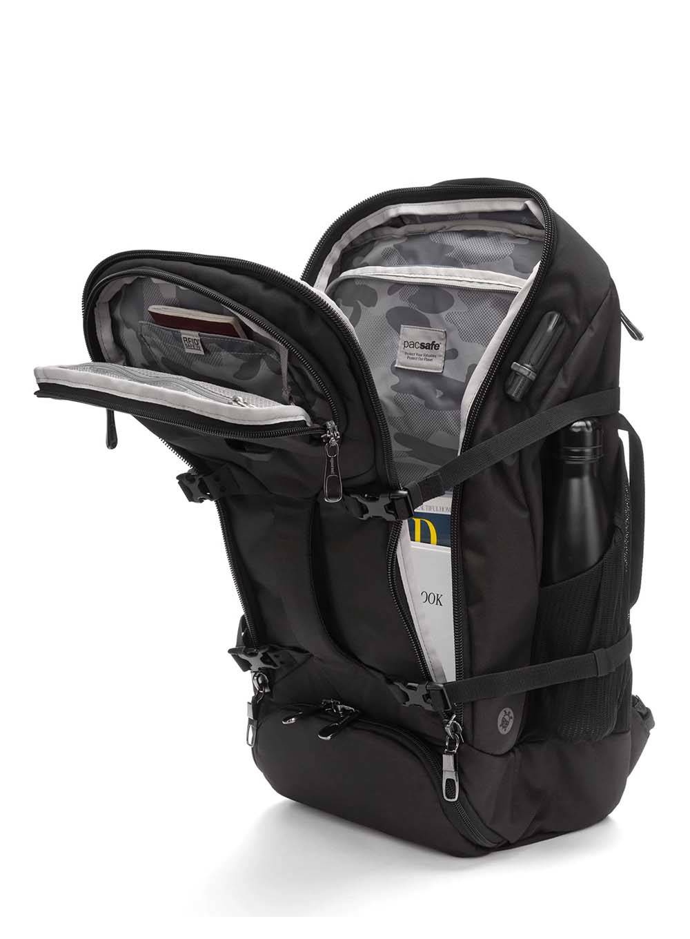 Plecak turystyczny zawiera najnowszą technologię antykradzieżową Pacsafe – samoblokujący zamek błyskawiczny i jest wykonany z 37 plastikowych butelek z recyklingu. Hydrofobowy powłoka jest w 100% wolna od PFC.