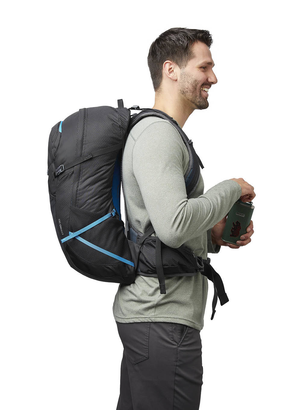 Po bokach plecaka umieszczono pasy kompresyjne, które mogą stanowić element mocujący dodatkowy sprzęt, czy odzież. System mocowania kijków trekkingowych lub innego sprzętu z systemem zapinania na bungee znajduję się na froncie plecaka. Dodatkowo na lewym ramieniu znajdziesz pętle na okulary przeciwsłoneczne, czyli praktyczny system Sunglass QuickStow. Do modelu dołączony jest także pokrowiec przeciwdeszczowy, który chroni ekwipunek, gdy pogoda ulegnie pogorszeniu.