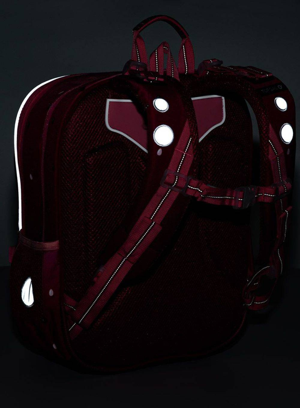 Plecak BAZI ma dużo elementów odblaskowych. Są umieszczone z przodu, z boków i na szelkach. Odblaski doceniamy zwłaszcza po zmroku lub zimą - zwiększają widoczność dziecka - i to jeszcze jak!