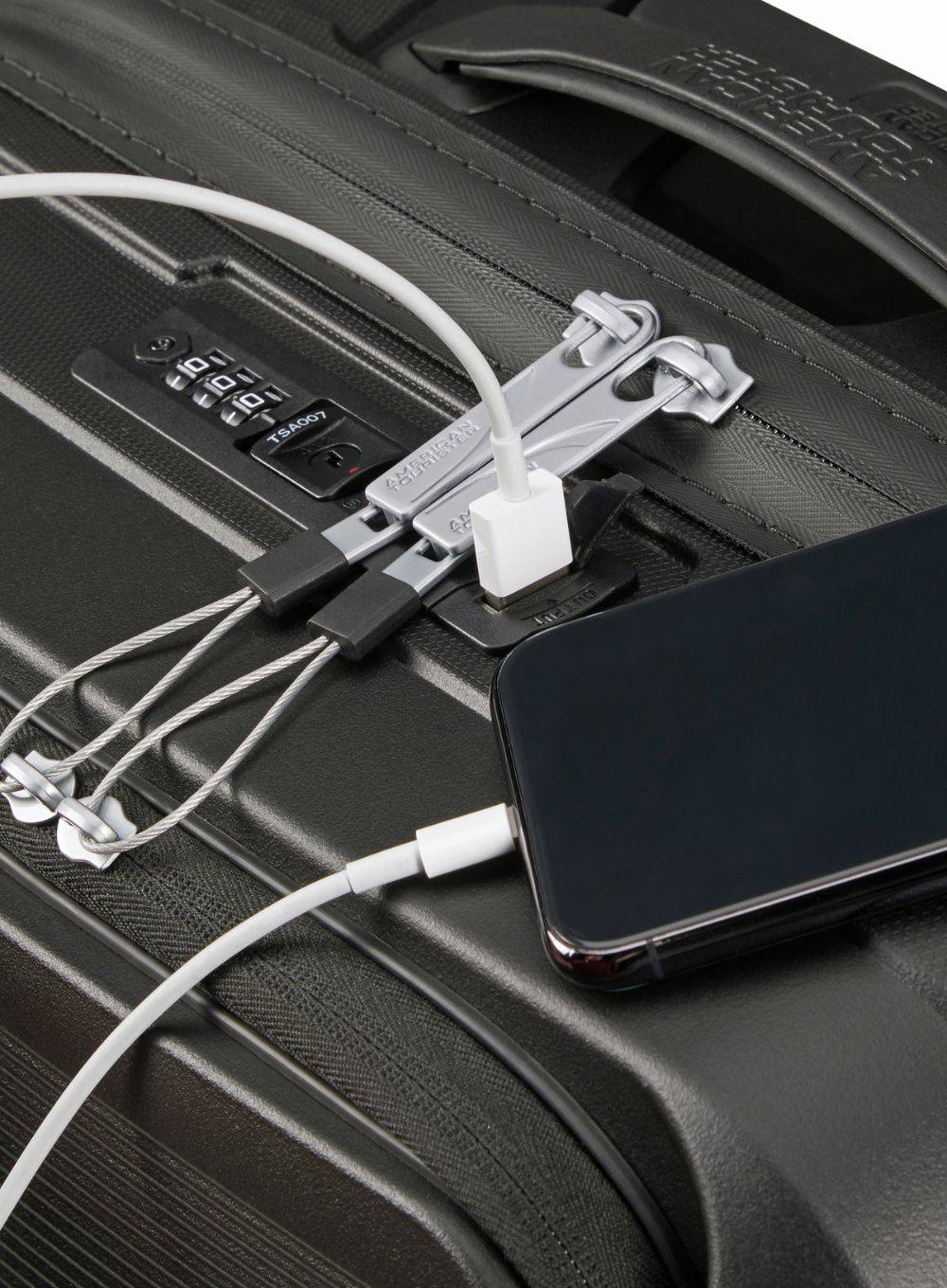 Walizka kabinowa American Tourister Airconic Frontloader ma kieszeń z przodu, do której zmieści się laptop 15,6", tablet i power bank. Większe i mniejsze przegródki organizera ułatwiają utrzymanie sprzętu w porządku, bez względu na cel podróży.