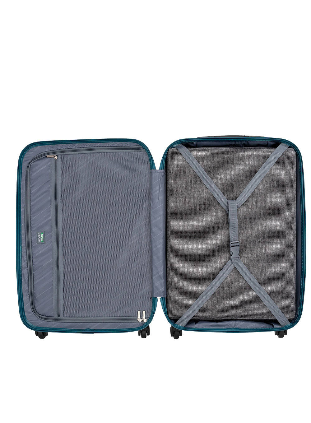 Wnętrze walizki jest podzielone na na dwie części. Dolna komora posiada regulowane pasy, uniemożliwiające przesuwanie się bagażu, a górna zapinaną na zamek tekstylną przegrodę z kieszenią. Wewnątrz znajduje się dodatkowa, mała kieszonka zapinana na suwak na kosmetyki, kable i inne akcesoria.