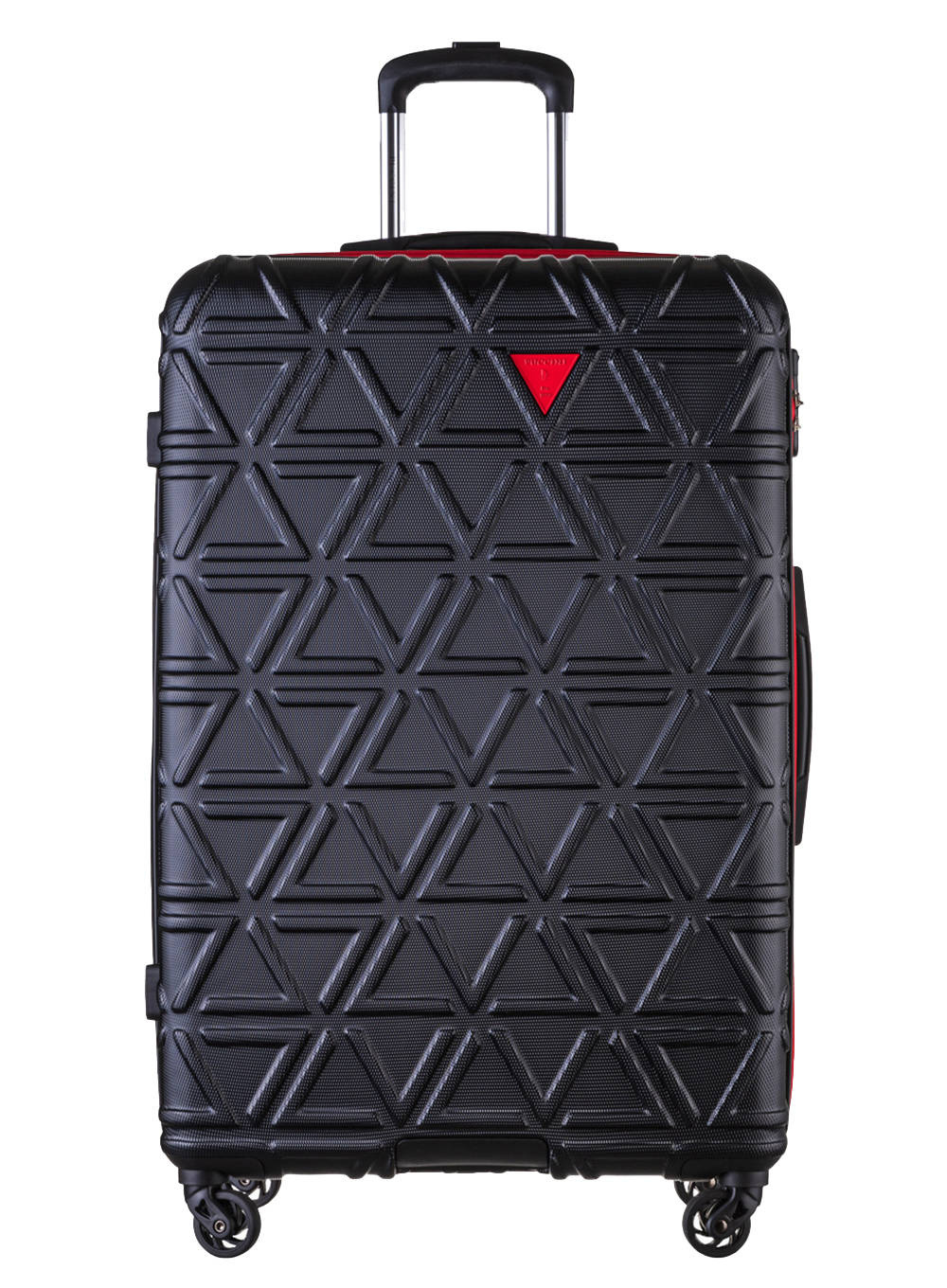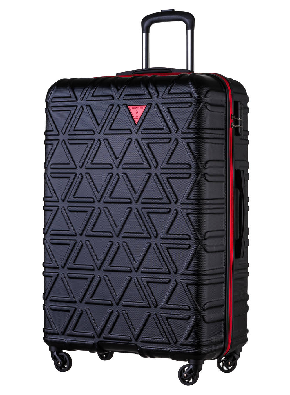 Najnowsza kolekcja walizek California firmy Puccini to walizki i kuferki podróżne, które mają klasyczną formę i efektowny, nowoczesny wygląd. Oryginalny, wytłaczany wzór trójkątów i detale w kontrastowym kolorze przyciągają uwagę. Z przodu w odwróconym trójkącie znajduje się logo i napis Puccini, który stanowi designerski detal. Trójkątne logo jest w kontrastowym kolorze, tak samo jak podszewka oraz zamek błyskawiczny.