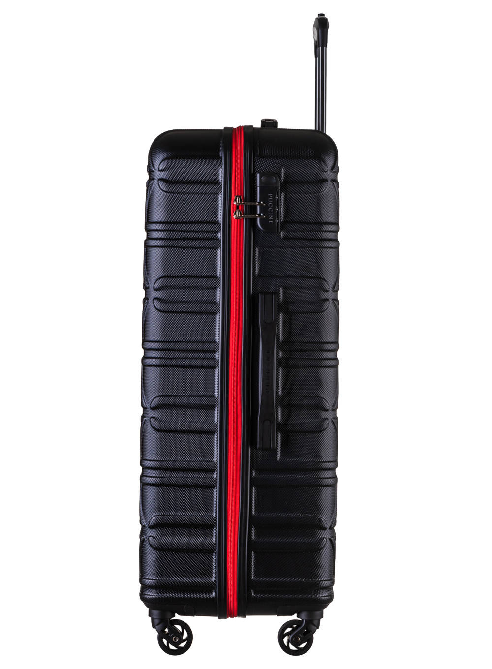 Duża, twarda walizka Puccini California została wykonana z wysokiej jakości tworzywa ABS o dużej twardości i wytrzymałości. Ma cztery zwrotne koła i teleskopowy uchwyt do bezproblemowego poruszania się z puntu A do punktu B, bez względu na jakość nawierzchni. Uchwyty na górze i z boku umożliwiają podnoszenie i przenoszenie. Na jednej ze ścian bocznych znajdują się cztery ochronne nóżki, które pozwalają na położenie walizki bez ryzyka zarysowania (walizka w rozmiarze kabinowym nie posiada nóżek ochronnych).