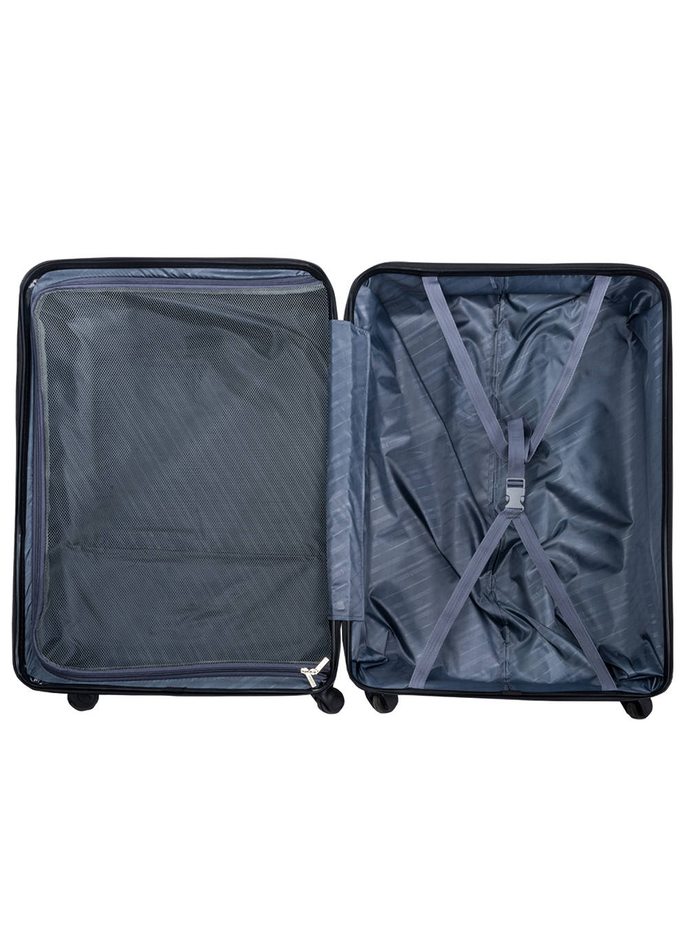 Wewnątrz walizek umieszczono regulowane pasy krzyżowe utrzymujące garderobę, uniemożliwiające przesuwanie się ubrań i rzeczy osobistych.