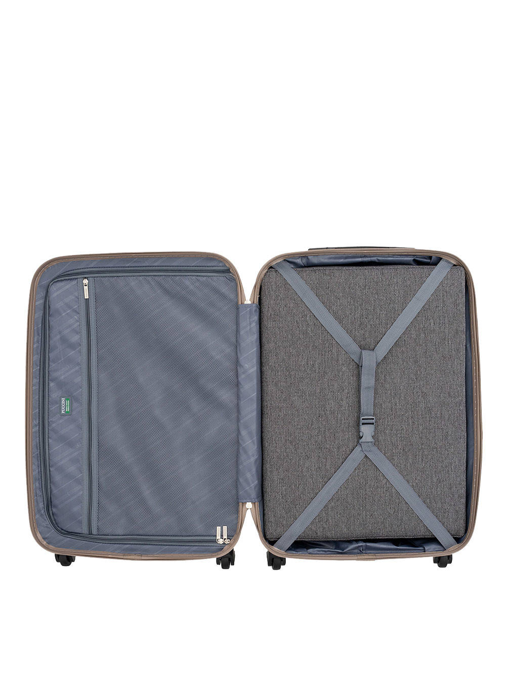 Wnętrze średniej walizki Paris jest podzielone na na dwie części. Dolna komora posiada regulowane pasy, uniemożliwiające przesuwanie się bagażu, a górna zapinaną na zamek tekstylną przegrodę z kieszenią. Wewnątrz znajduje się dodatkowa, mała kieszonka zapinana na suwak na kosmetyki, kable i inne akcesoria.