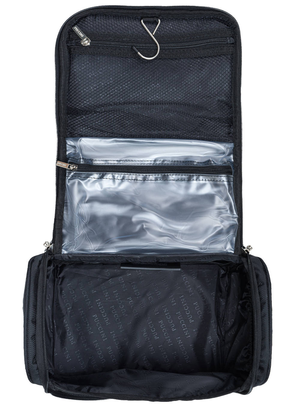 Kuferek jest jednokomorowy, otwierany do góry. Z przodu znajduje się funkcjonalna kieszeń na drobiazgi, z logo Puccini. Na wewnętrznej stronie klapy umieszczono dwie kieszenie zapinane na zamek: z siatki i foliową. Dodatkowo kuferek posiada wbudowany haczyk, umożliwiający rozłożenie i powieszenie go w dowolnym miejscu. Takie rozwiązanie gwarantuje szybki i precyzyjny dostęp do niezbędnych kosmetyków i przyborów higienicznych.