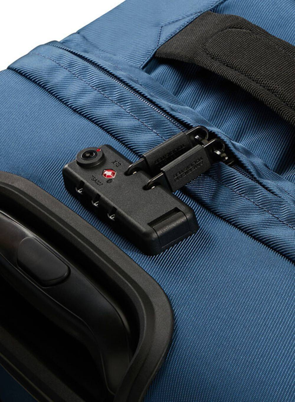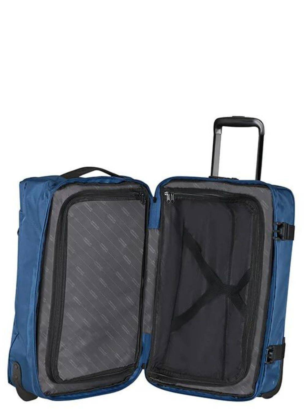 Torba na 2 koła American Tourister Urban Track S posiada dwie komory. Dolna komora posiada dwa elastyczne paski i zapinaną na zamek siatkową przegrodę. Górna komora ma również zapinaną na zamek przegrodę, tekstylną utrzymującą rzeczy na miejscu. Dzięki temu możliwe jest sprawne uporządkowanie strojów i uniknięcie przepełnień podczas otwierania. Na zewnątrz dwie przednie kieszenie pozwalają na przechowywanie książek i dokumentów podróżnych pod ręką.