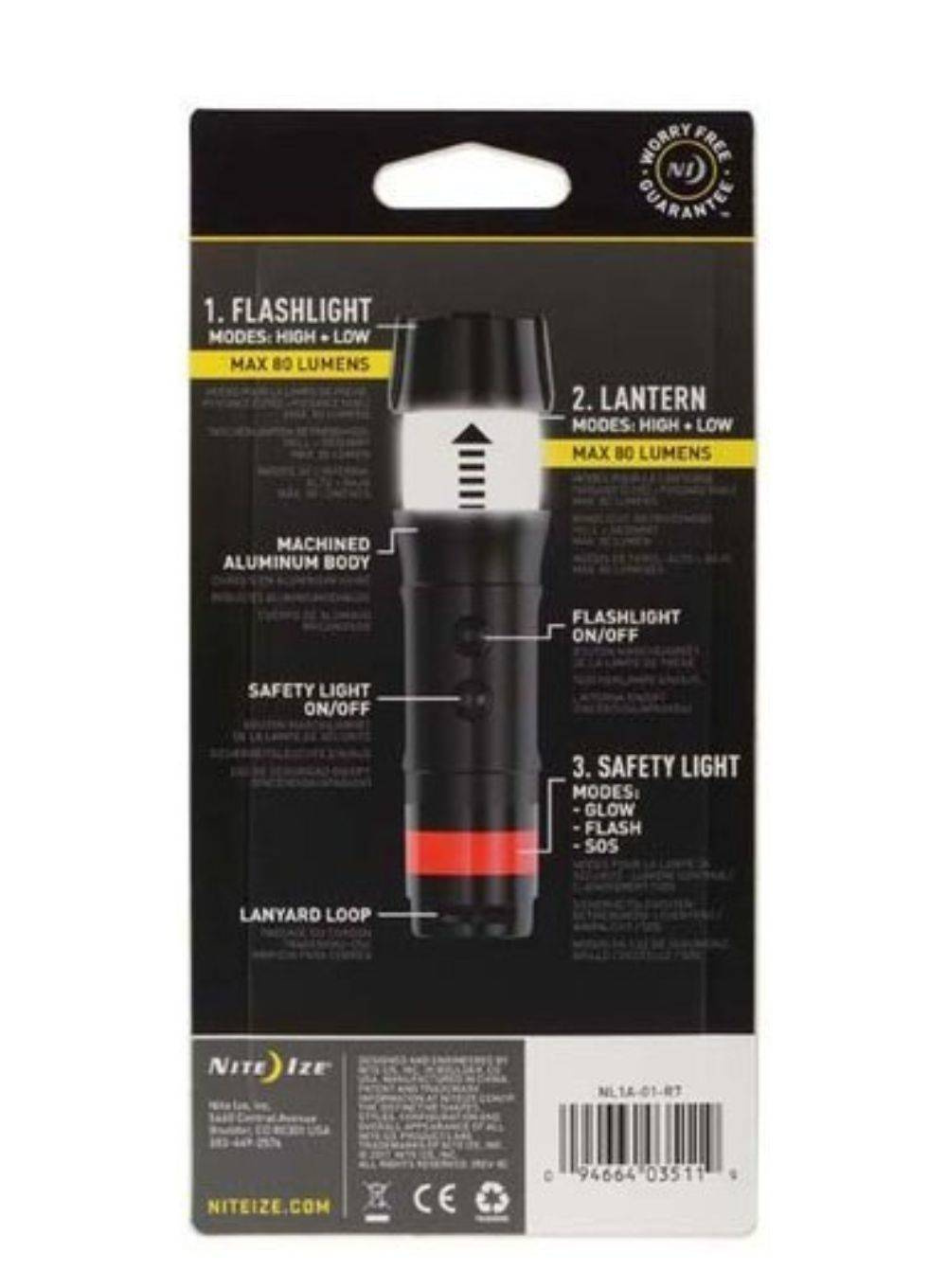 Mini latarka Nite Ize Radiant® 3in1™ LED Mini Flashlight o mocy 80 lumenów ma tylko 4,5 cala długości i może być używana jako latarka, światło bezpieczeństwa lub szybko przekształcona w mini latarnię za pomocą prostego ruchu. Zasilana jedną baterią AA i umieszczona w trwałej obudowie z aluminium, jest to wszechstronne i ultrakompaktowe rozwiązanie oświetleniowe.