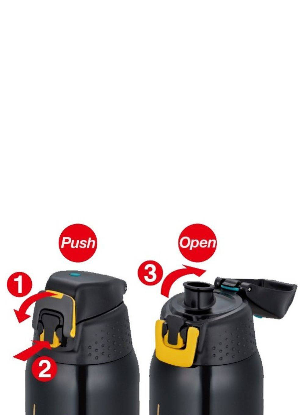 Otwieranie termosu jest bardzo proste i szybkie. Termos otworzysz jedną ręką. Instrukcja: 1 - odbezpiecz zatrzask, 2 - naciśnij dolną część przycisku, 3 - wieczko termosu otworzy się.