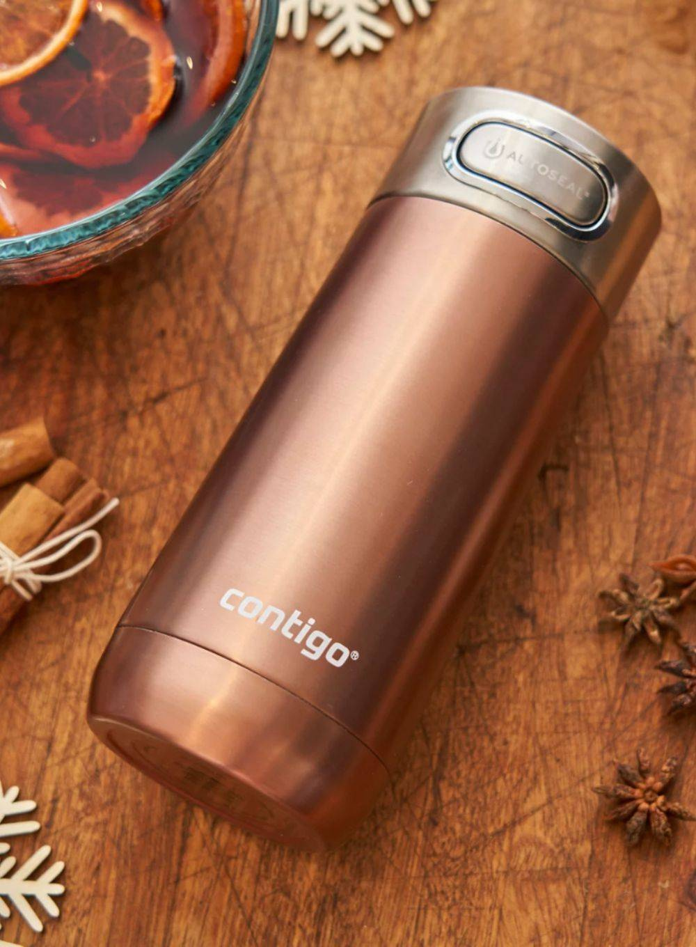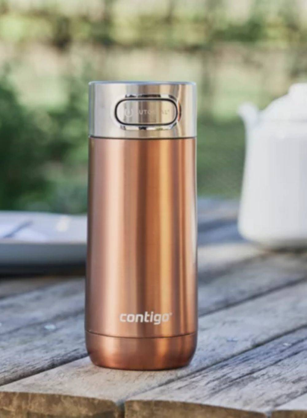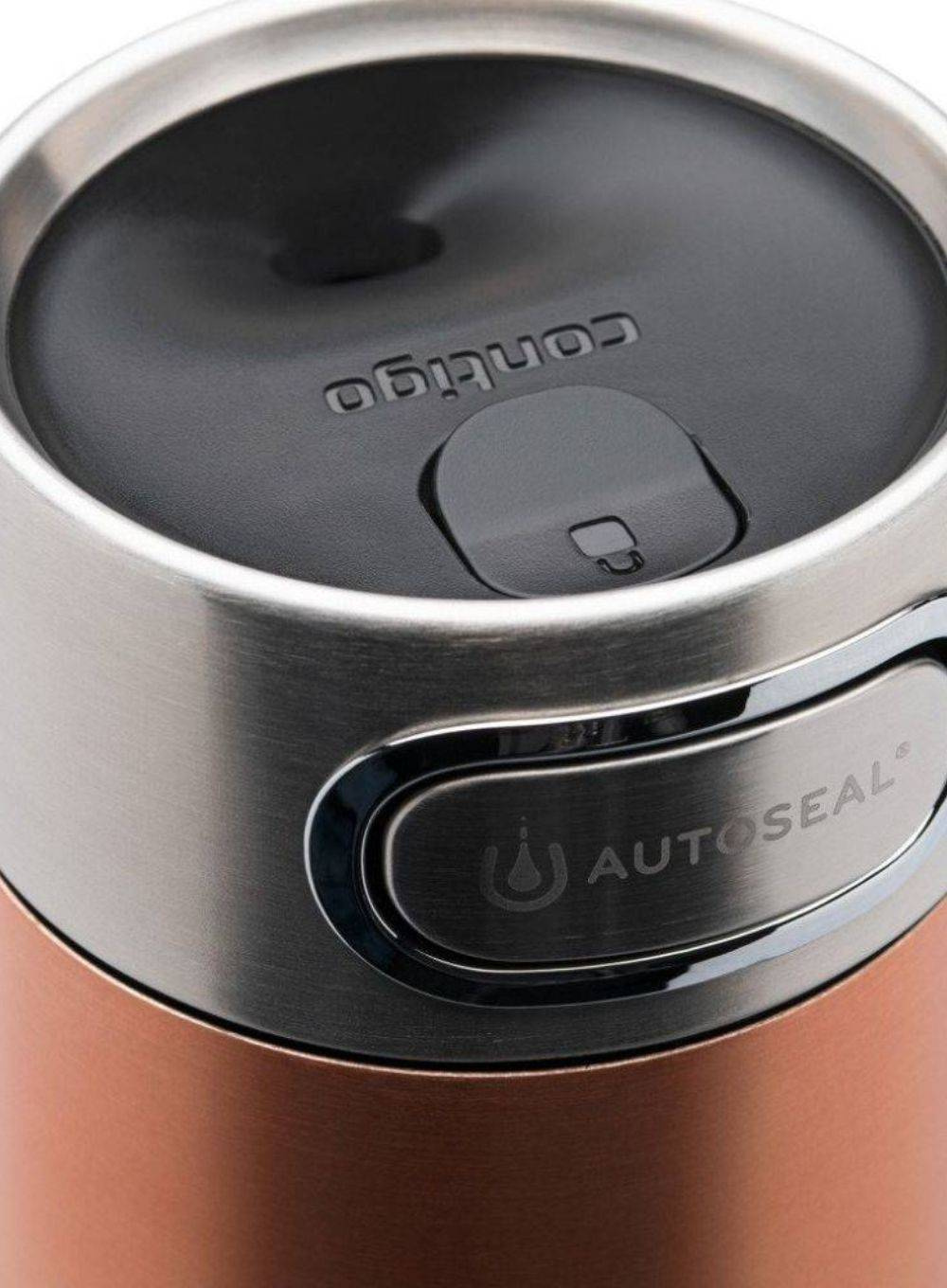 Kubek termiczny Contigo The Luxe dzięki opatentowanej technologii AUTOSEAL® jest w pełni szczelny Jednym przyciskiem w pokrywie otwierasz i zamykasz. Skuteczny sposób na uniknięcie rozlewania napoju.
