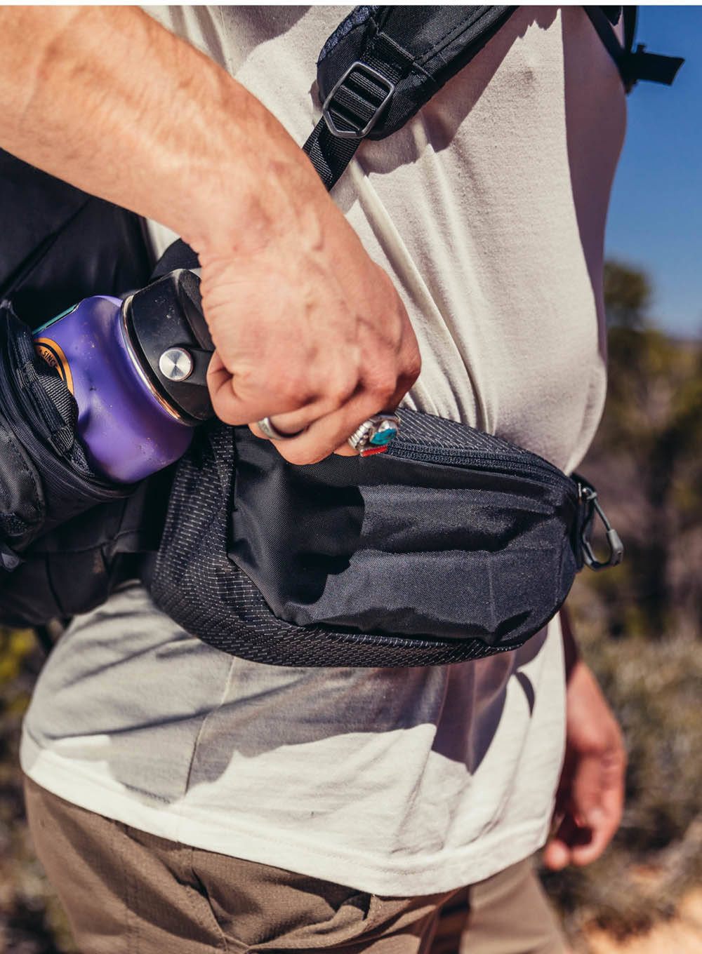 • Ponadgabarytowe zapinane na zamek kieszenie na pasie biodrowym z wystarczającą ilością miejsca, aby zmieścić telefony komórkowe i akcesoria niezbędne na szlaku