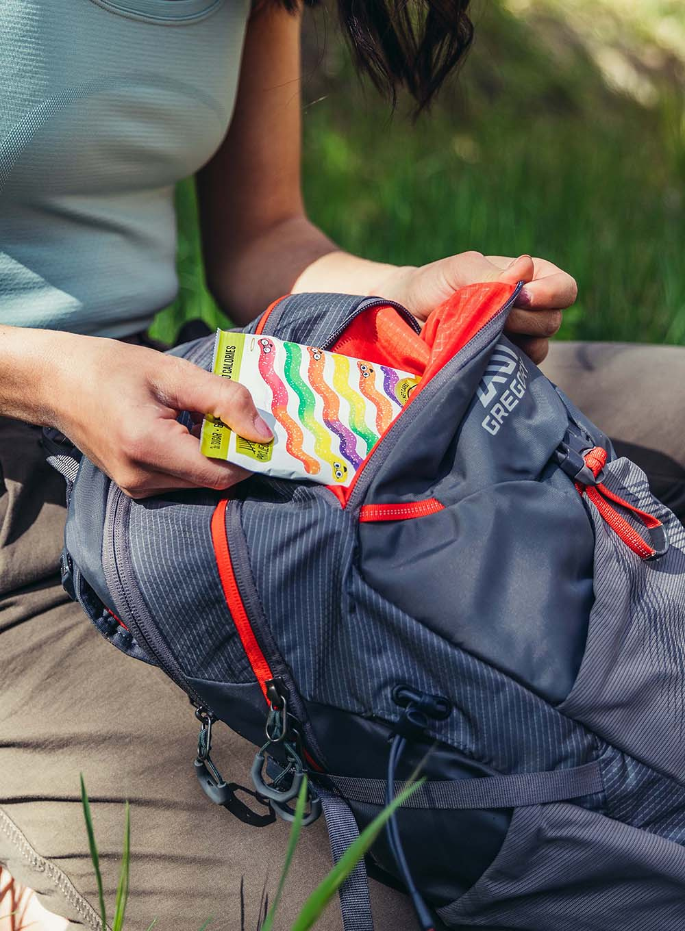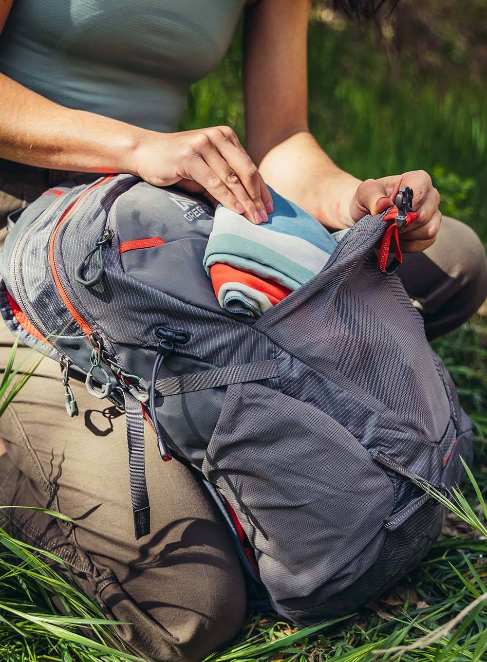 - Niezależna kieszeń zapinana na zamek z mocowaniem na bukłak SpeedClip, kompatybilna z bukłakiem Hydro Reservoir Gregory (brak bukłaka w plecaku)