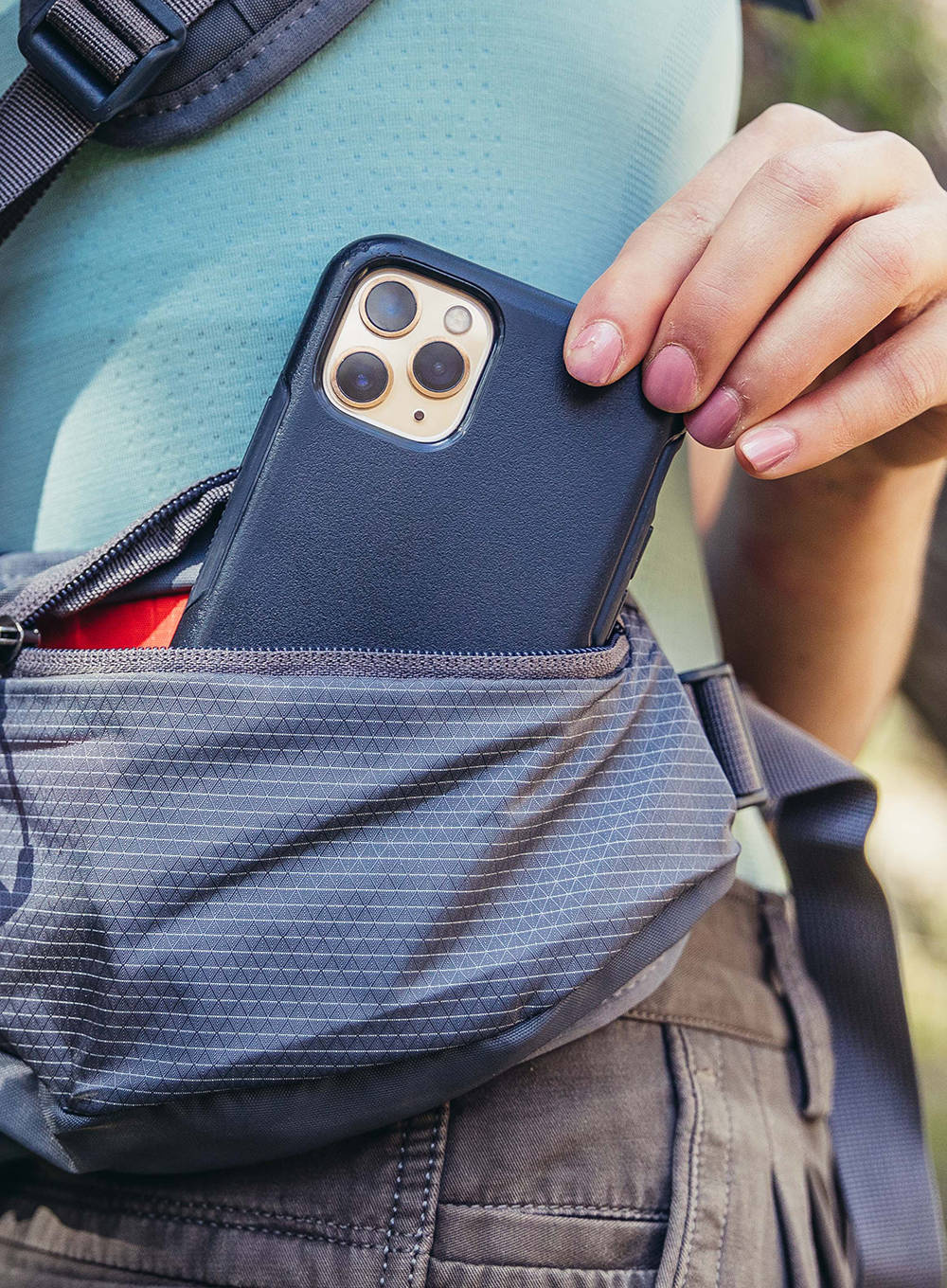 Kieszenie przyjazne dla telefonu - podwójnie zapinane na zamek kieszenie na pasie biodrowym, wystarczająco duże, aby pomieścić telefon, ułatwiają uchwycenie chwil podczas przygody, a duże boczne kieszenie z siatki pochłoną duże butelki próżniowe.