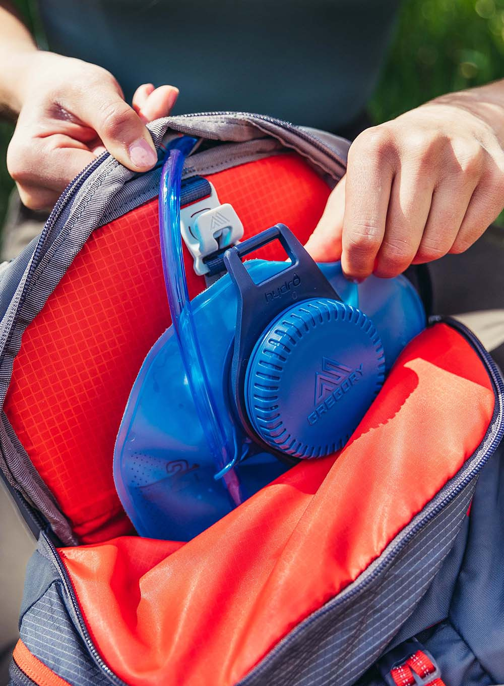 - Niezależna kieszeń zapinana na zamek z mocowaniem na bukłak SpeedClip, kompatybilna z bukłakiem Hydro Reservoir Gregory (brak bukłaka w plecaku)