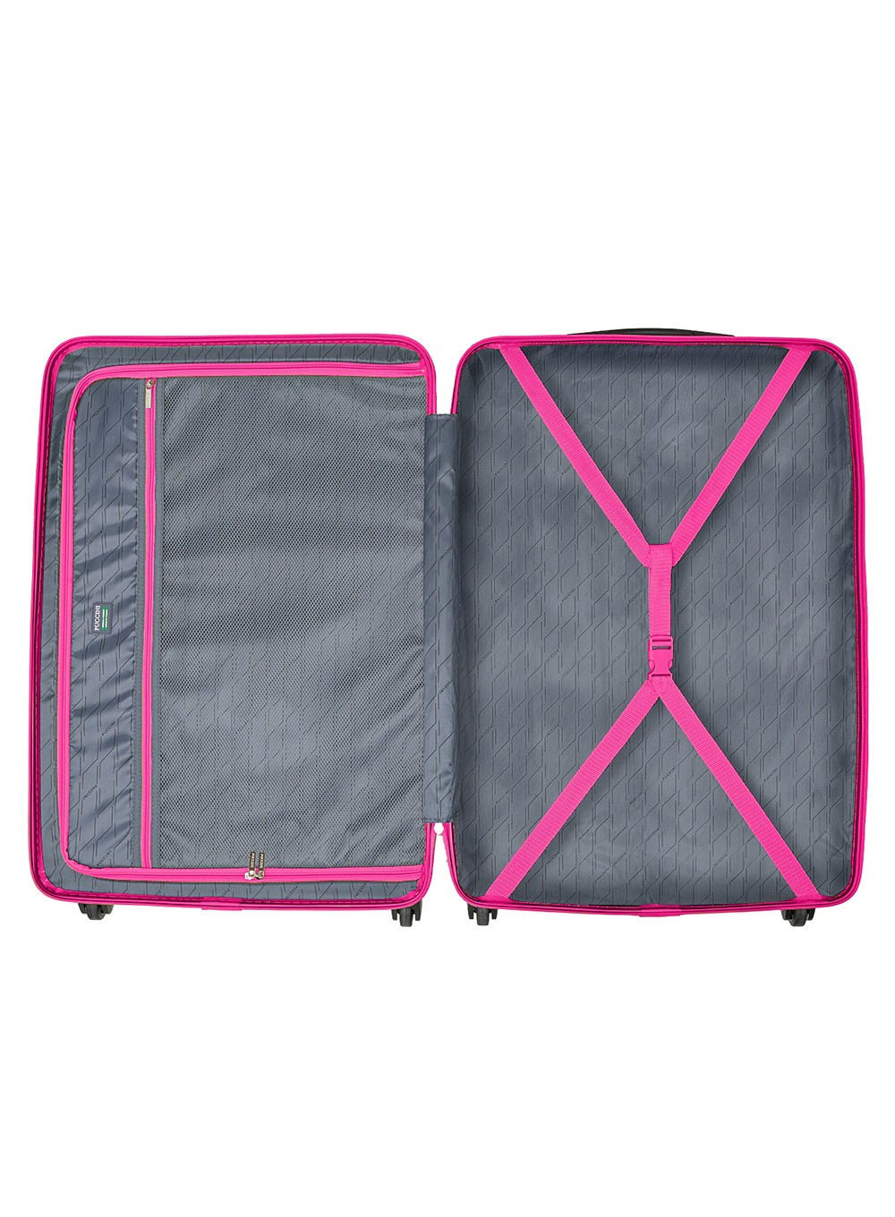 Wnętrze walizki jest podzielone na dwie części. Górną komorę zamyka materiałowa klapa z kieszenią z siatki, która zdecydowanie ułatwi organizację bagażu. Dolna komora posiada pasy mocujące, które ułatwiają zachowanie porządku. Obie komory walizki wykończono elegancką podszewką, której zadaniem jest również ochrona przed wilgocią.