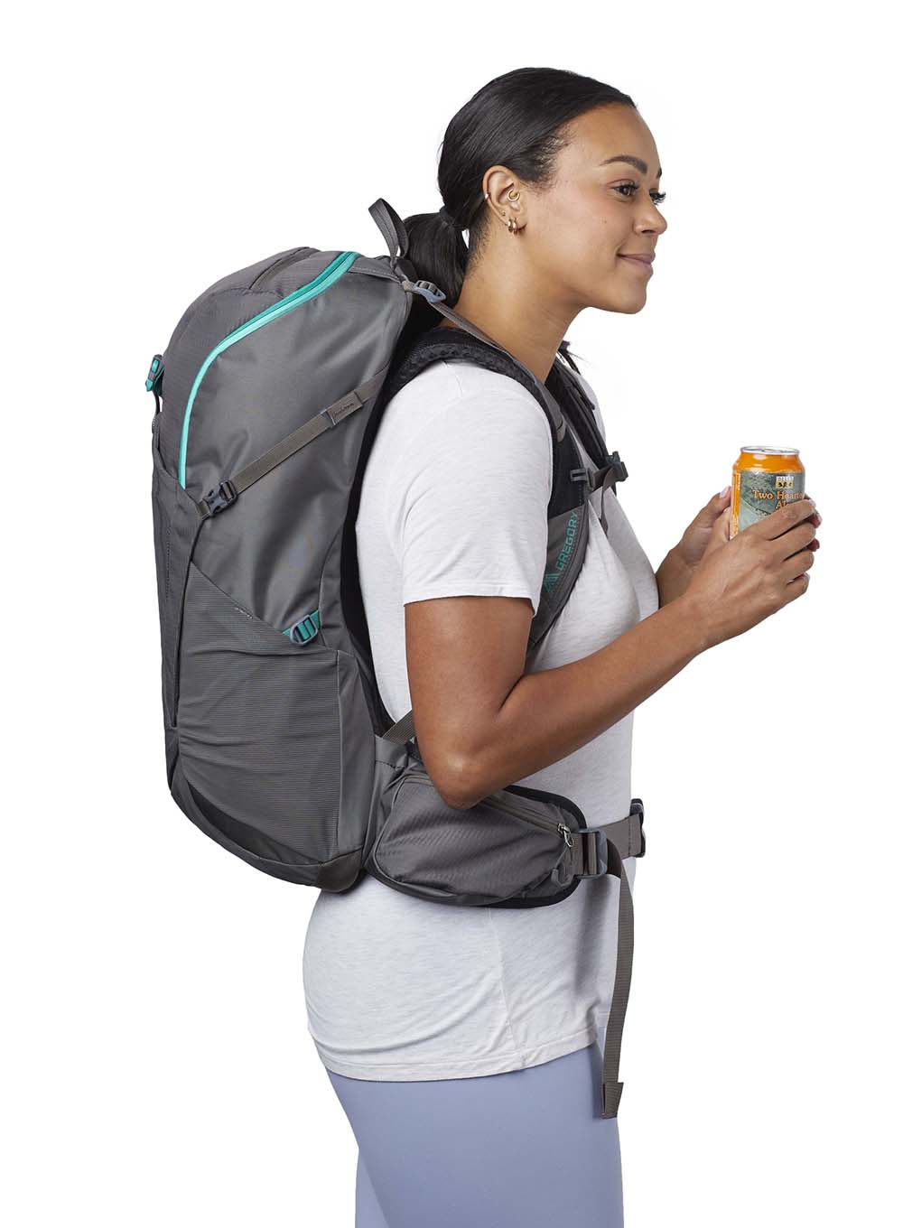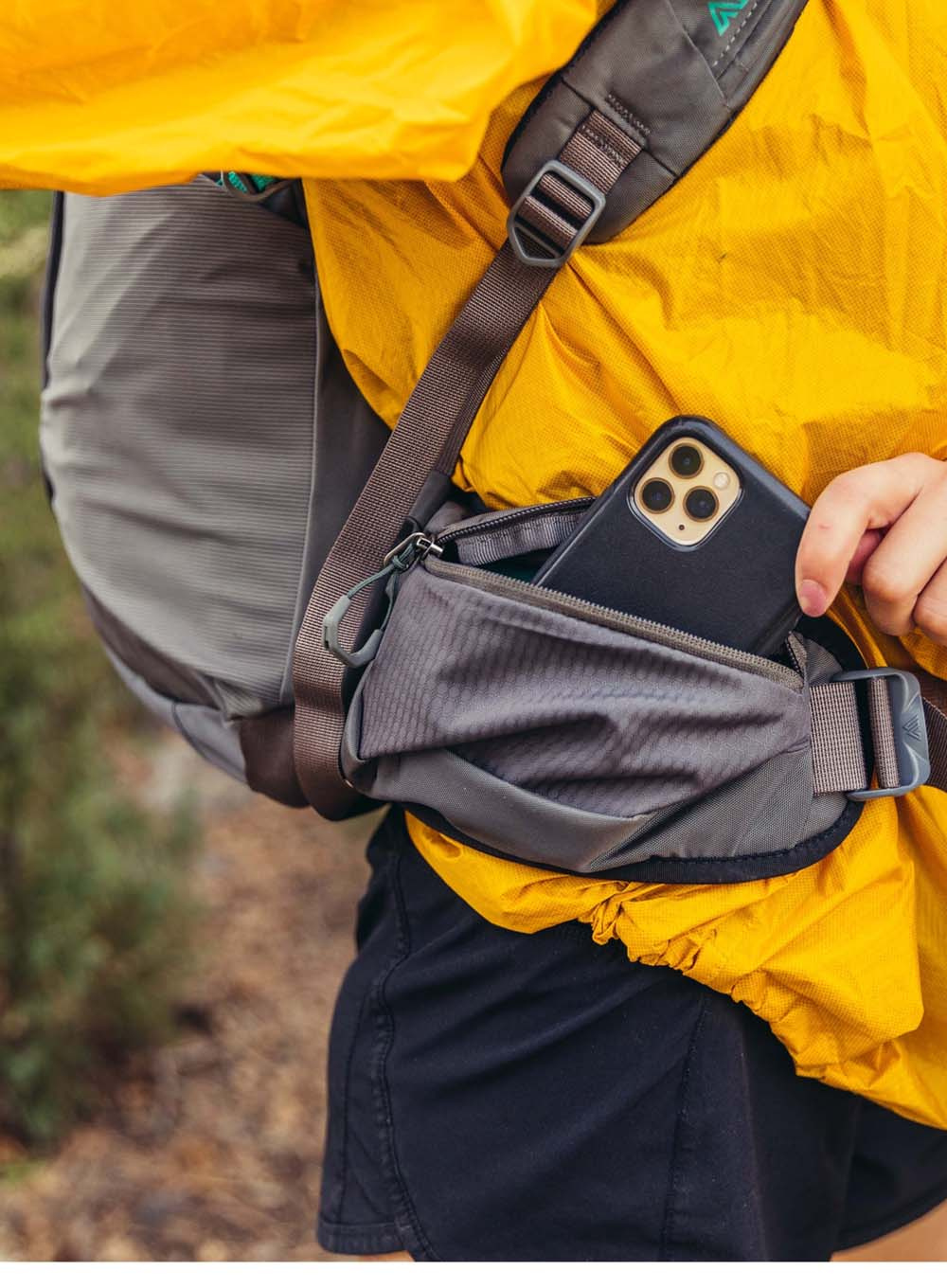 Elastyczny, wyściełany pas biodrowy FreeFloat dopasowuje się do dolnej części pleców i bioder, utrzymując ciężar plecaka i poruszając się swobodnie zgodnie z naturalnym ruchem podczas wędrówki, a wyjątkowo duże kieszenie w pasie biodrowym pomieszczą telefon i zdrowe przekąski.