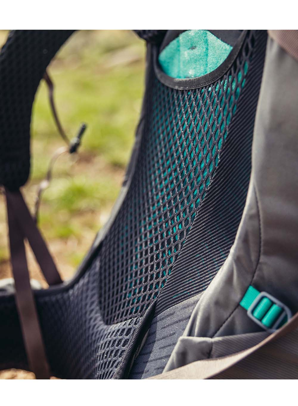 • Siatka dystansująca na plecach umożliwia swobodny przepływ powietrza między plecami a bryłą plecaka
