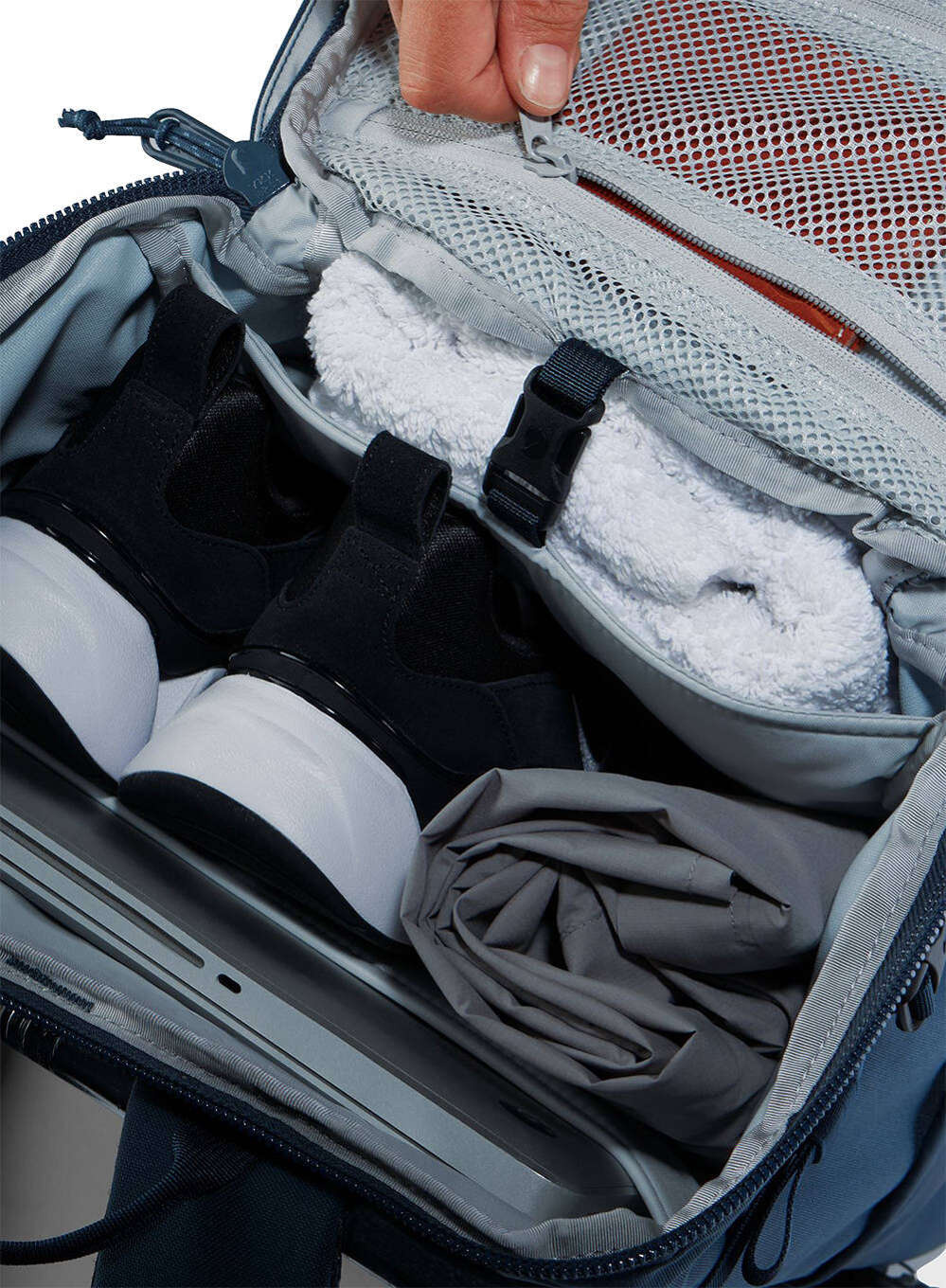Dostęp do plecaka zapewniony szerokim otwarciem w kształcie litery U. Wnętrze kryje w sobie kieszeń na laptopa oraz mniejsze kieszenie organizacyjne mieszczące np. długopisy czy notes.